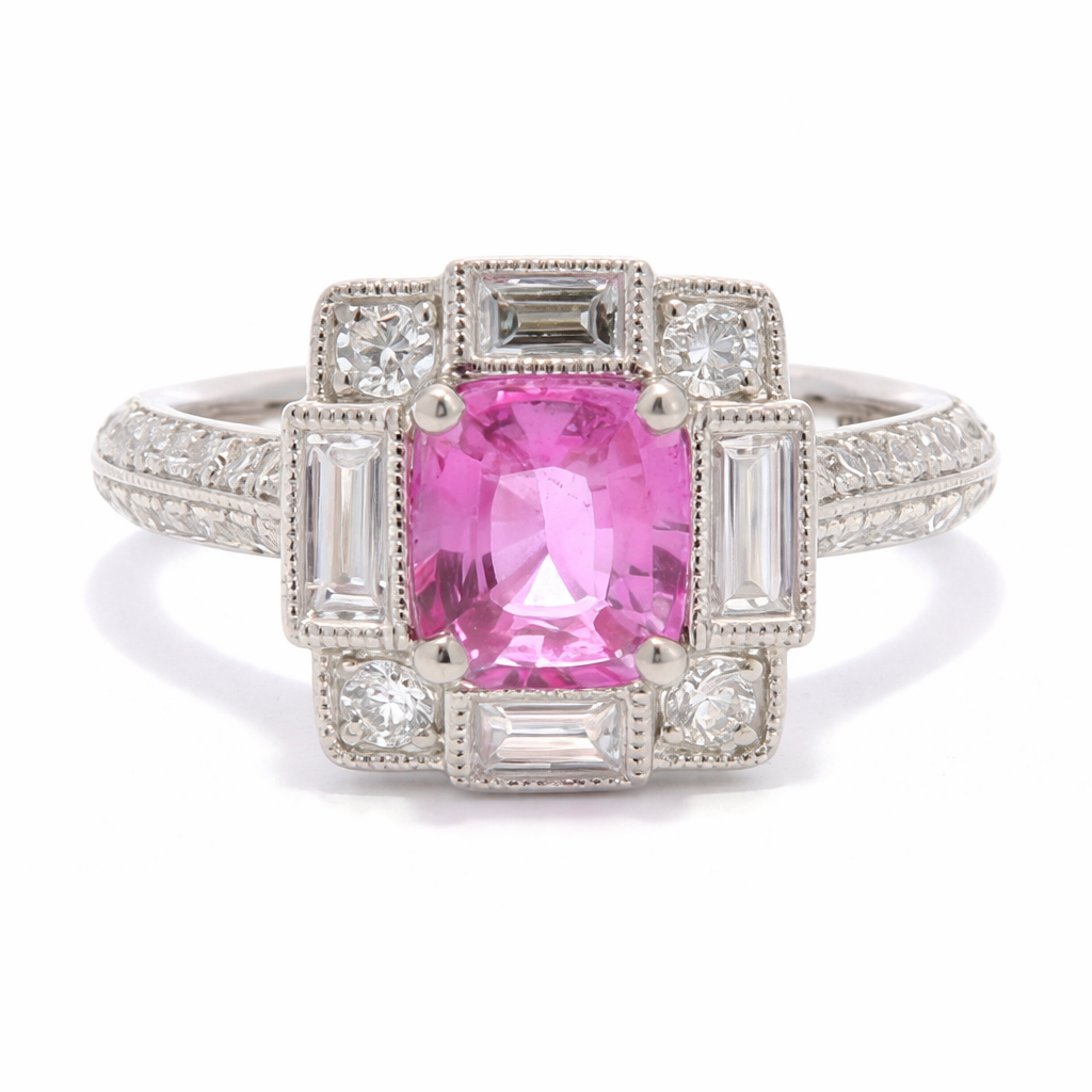 A brand-new, unused, certified natural diamond and pink sapphire flower-shaped cluster ring, crafted in platinum, showcases refined colour, balance, and light. At the centre sits a cushion-cut pink sapphire weighing 1.07 carats, offering a delicate yet vivid hue with excellent presence. Surrounding the centre stone is a halo of four baguette-cut and four brilliant-cut natural diamonds, complemented by a further cluster of brilliant-cut diamonds set along the shoulders. The total diamond weight of 0.75 carats adds definition and sparkle while preserving an elegant, floral silhouette.