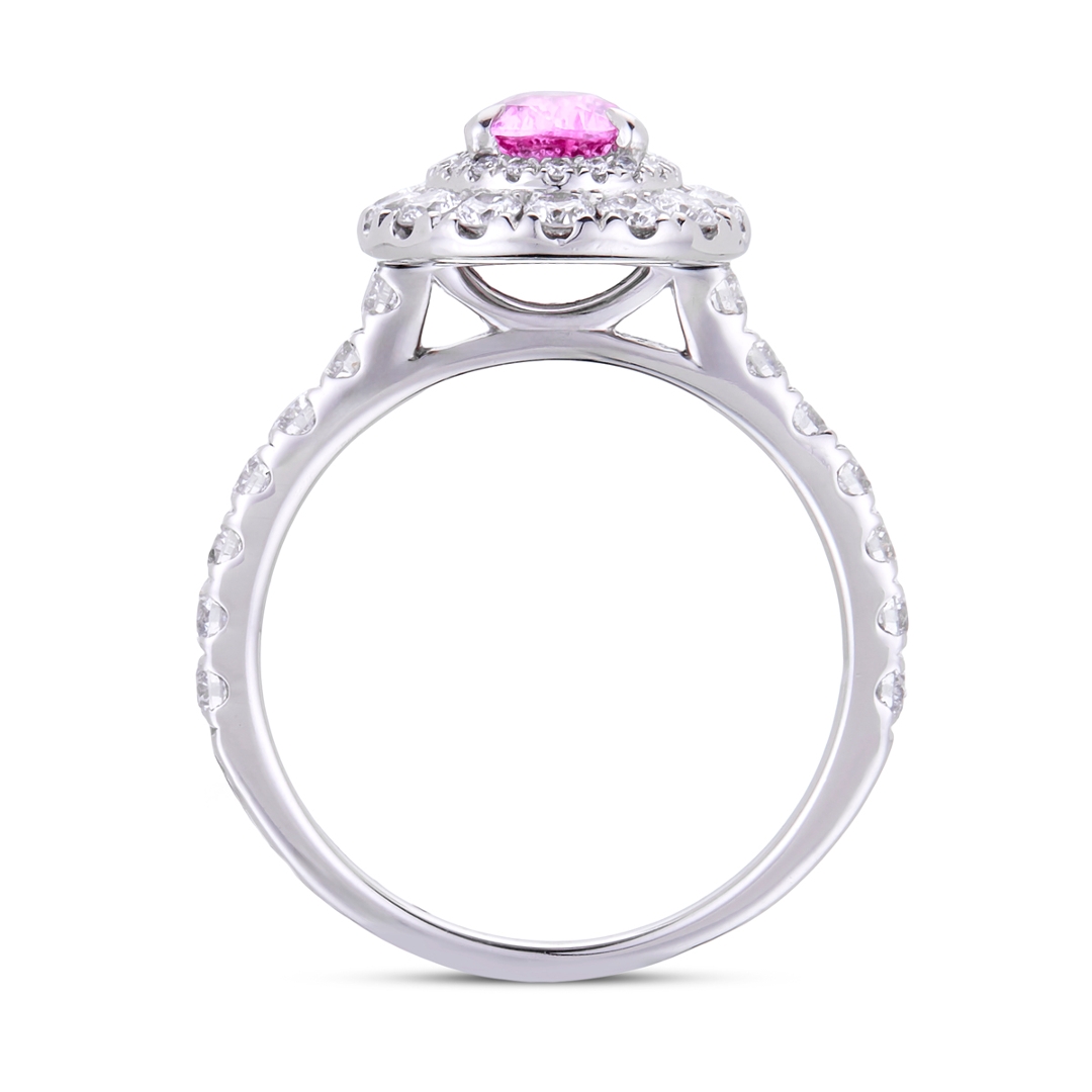 A brand-new, unused certified natural diamond and pink sapphire cluster ring that brings together vibrant colour, refined sparkle and an elegant, elongated silhouette. At its centre sits a 1.11ct pear-shaped mixed-cut pink sapphire, displaying a purplish-pink tone with warmth, depth, and lively brilliance. The pear shape enhances the stone’s natural vibrancy, creating a graceful drop that catches the light beautifully and gives the ring a feminine, eye-catching presence. Surrounding the sapphire is an impressive arrangement of natural brilliant-cut diamonds totalling 1.10ct in F–G colour and VS2–SI1 clarity, forming a striking double halo that intensifies the centre stone’s colour while adding a luxurious, radiant frame.