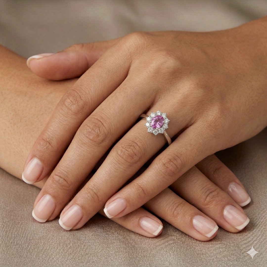 A brand-new, unused certified natural diamond and pink sapphire cluster ring, beautifully crafted in platinum and designed to highlight the delicate contrast between soft colour and radiant brilliance. At the centre of the design sits an elegant oval-cut pink sapphire weighing 1.12ct, displaying a vibrant blush tone that immediately captures attention. The graceful oval cut enhances the gemstone’s natural colour and light reflection, creating a refined focal point that lends the ring a sophisticated, feminine presence within its classic cluster setting.