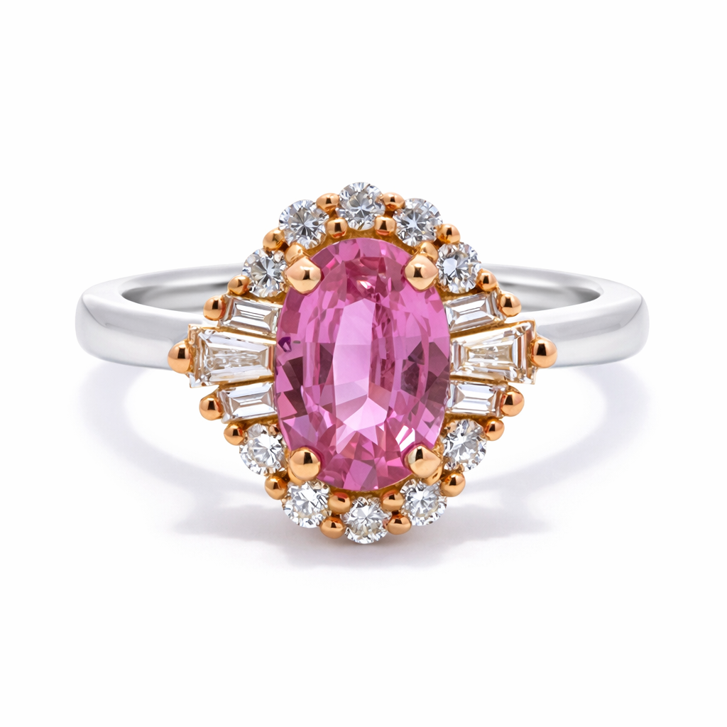 A brand-new, unused certified natural diamond and pink sapphire cluster ring, beautifully crafted in platinum and 18ct rose gold. At the centre of the design sits an elegant oval-cut pink sapphire weighing 1.20ct, presenting a rich, vibrant hue that contrasts beautifully with the cool tone of the platinum setting. The gemstone is carefully positioned to command attention while maintaining a refined, balanced appearance, allowing the sapphire's colour and natural beauty to stand out within the overall composition.