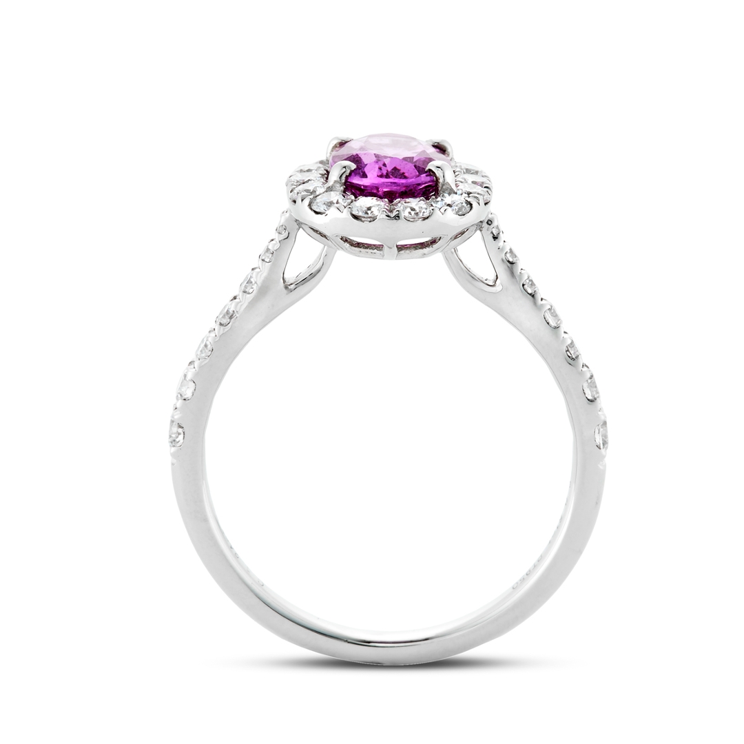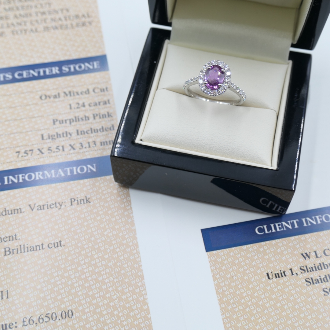 A brand-new, unused certified natural diamond and pink sapphire cluster ring that radiates exceptional beauty, craftsmanship, and value. At its centre lies a 1.24-carat oval mixed-cut pink sapphire of vivid purplish-pink hue, glowing with elegance and striking depth of colour. Surrounding the gemstone is a halo of brilliant-cut natural diamonds that extend along the shoulders, creating a spectacular display of light and sparkle. The diamonds, totalling 0.61 carats, are graded G–H in colour and VS2–SI1 in clarity, offering outstanding brilliance and contrast against the sapphire’s vibrant tone.