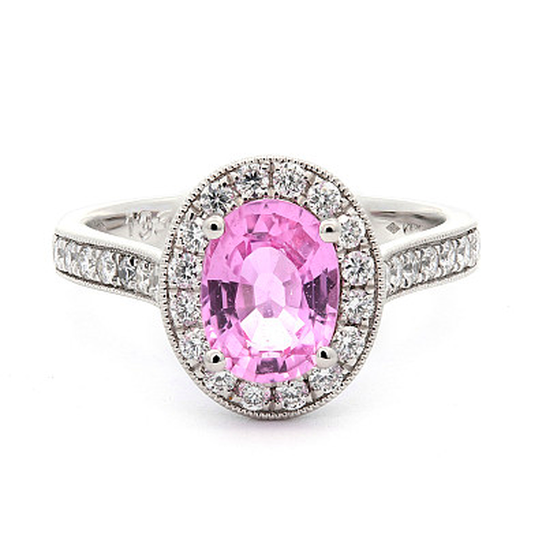 Encircling the centre stone is a halo of brilliant-cut natural diamonds, with further diamonds extending along the shoulders to add additional sparkle and dimension. These diamonds have a combined total weight of 0.37 ct, producing bright flashes of light that contrast beautifully with the soft pink hue of the sapphire. Natural diamonds are widely admired for their rarity, durability and enduring desirability, qualities that have made them the most celebrated gemstone within the world of fine jewellery.