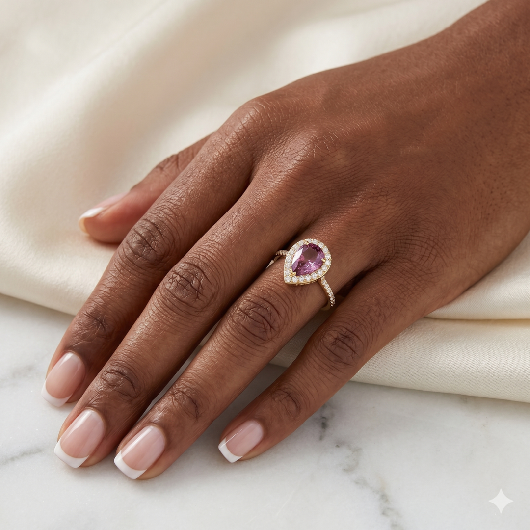 A brand-new, unused, certified natural diamond and pink sapphire gemstone pear-shaped cluster ring, this enchanting piece radiates elegance, colour, and timeless beauty. At its centre lies a captivating 1.35-carat pear mixed-cut pink sapphire, displaying a delicate brownish-pink hue that exudes warmth and sophistication. Surrounding the sapphire is a halo of brilliant-cut natural diamonds that continue along the shoulders, totalling 0.34 carats. The diamonds, graded F–G in colour and SI1–SI2 in clarity, add a scintillating brilliance that perfectly complements the gentle glow of the central gemstone, showcasing the natural beauty and refinement of genuine diamonds.