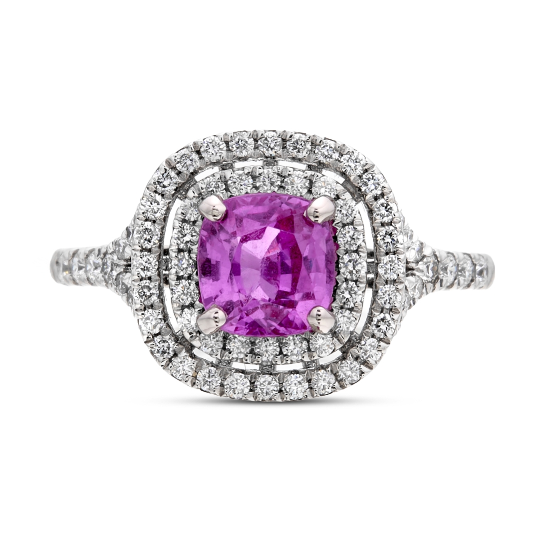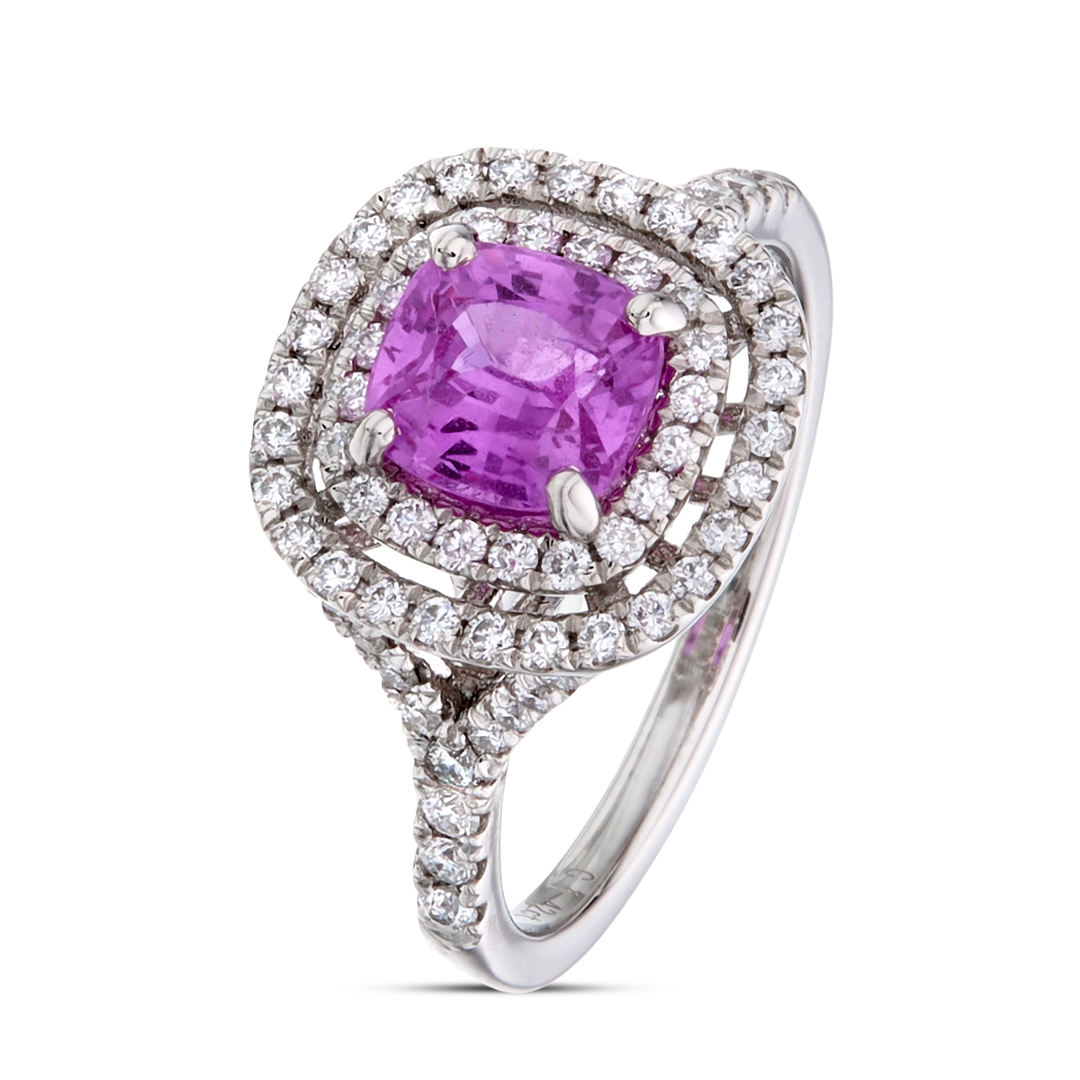 - > Natural Pink Sapphire 1.42ct & Diamond 0.48ct Cushion Shaped Cluster Ring
