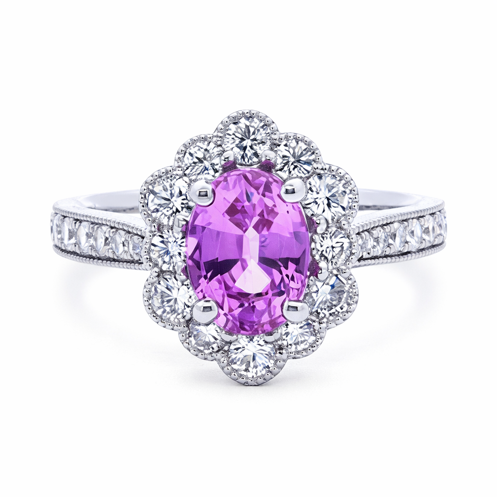 A brand-new, unused, certified natural diamond and pink sapphire flower-shaped cluster ring, elegantly crafted in platinum to showcase vibrant colour and refined brilliance. At its centre sits a captivating 1.42ct oval-cut pink sapphire, displaying rich rosy tones that offer both femininity and confident presence. The floral-inspired cluster design enhances the natural beauty of the sapphire, while the cool platinum setting provides a crisp and enduring frame that highlights its depth of colour.