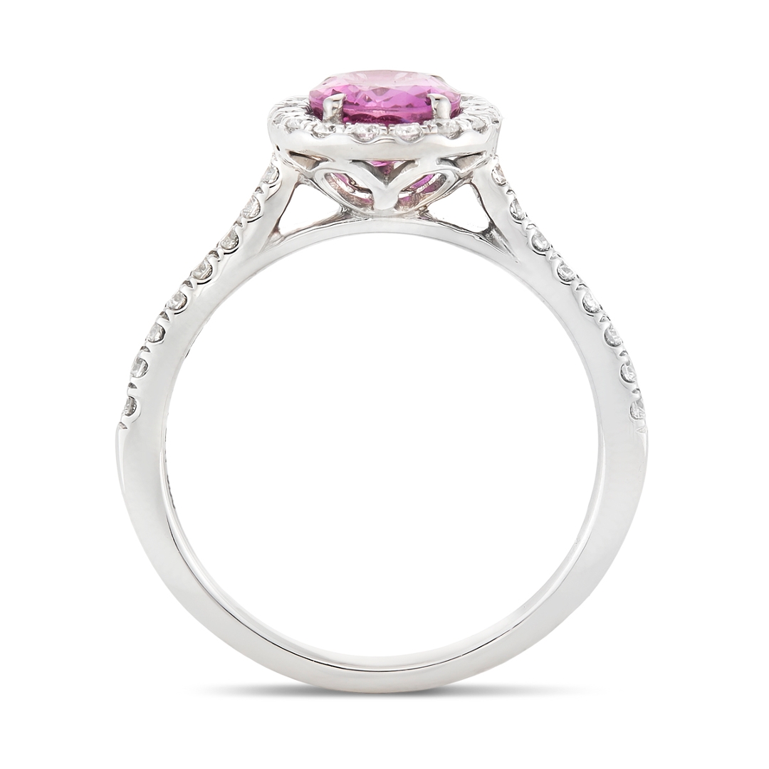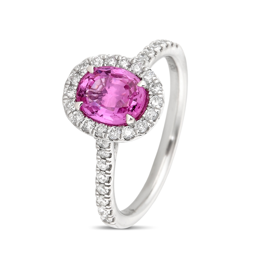 A brand-new, unused, certified platinum natural diamond & pink sapphire gemstone oval-shaped cluster ring, set with one oval mixed-cut pink sapphire gemstone at the centre & a cluster of brilliant-cut diamonds in a halo setting & on the shoulders.