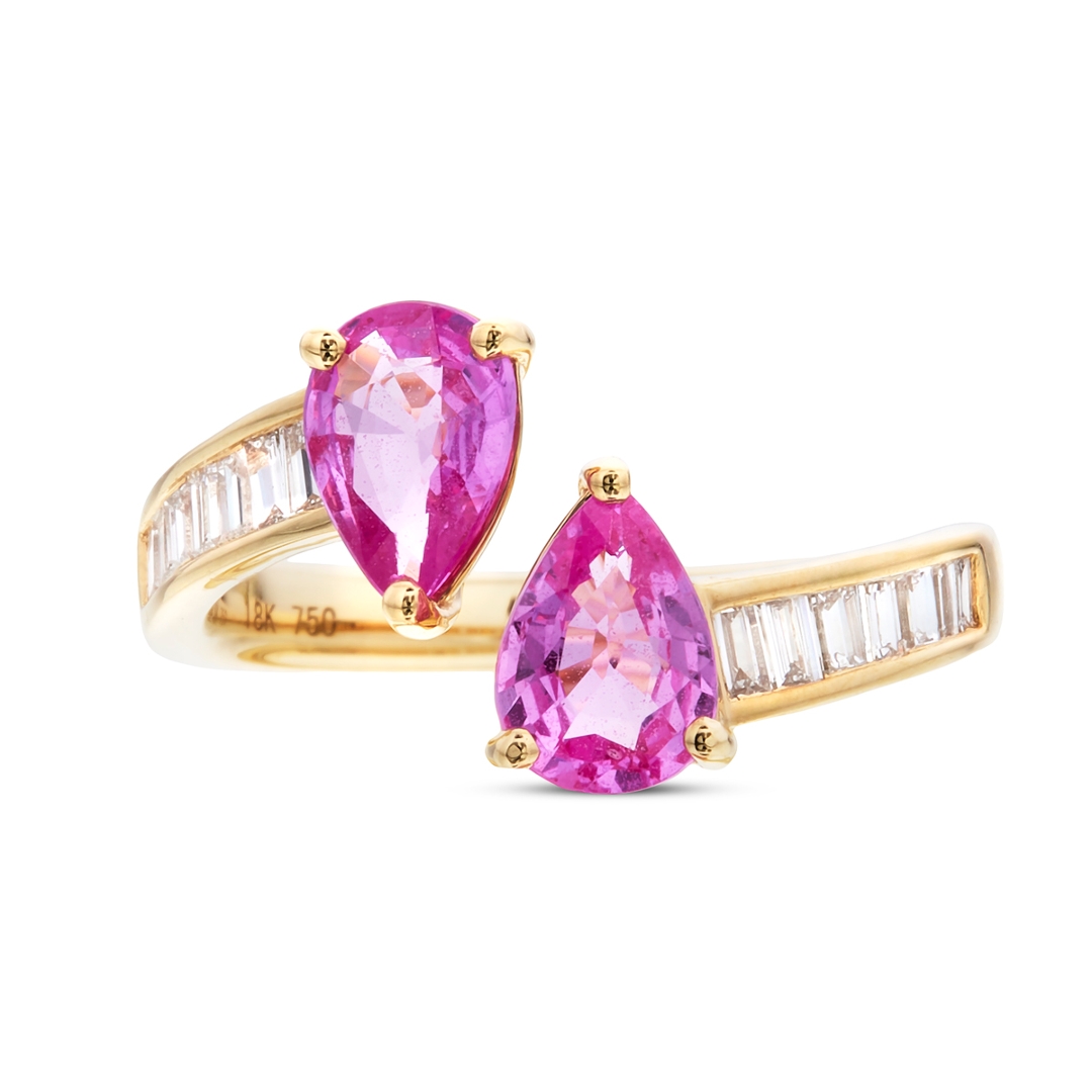 A brand-new, unused, certified natural diamond & pink sapphire pear-cut toi et moi ring, set with two pear mixed-cut pink sapphire gemstones at the centre & a cluster of baguette-cut diamonds to the shoulders, set in 18ct yellow gold.