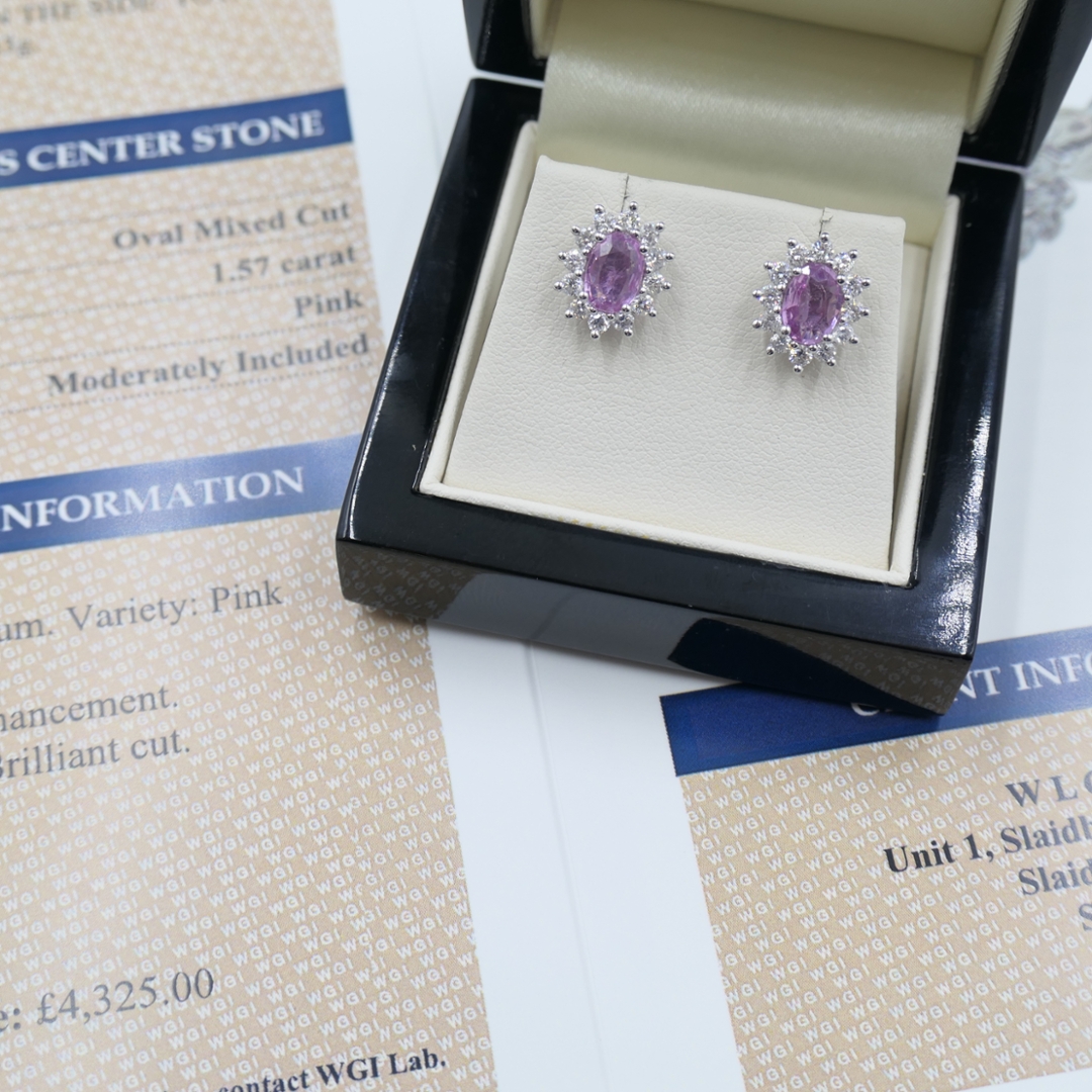 A brand-new, unused certified pair of natural diamond and pink sapphire gemstone cluster earrings, masterfully crafted in 18ct white gold. Each earring features an exquisite oval mixed-cut pink sapphire, together weighing 1.57 carats, radiating a soft yet vivid pink hue that captures the essence of femininity and grace. Surrounding each sapphire is a dazzling cluster of brilliant-cut natural diamonds, totalling 0.72 carats, with G-H colour and SI1–SI2 clarity. Their crisp sparkle enhances the gentle warmth of the sapphires, creating a perfect harmony of light and colour. The cool white gold setting adds a refined brilliance, ensuring the gemstones shine with exceptional clarity and elegance.
