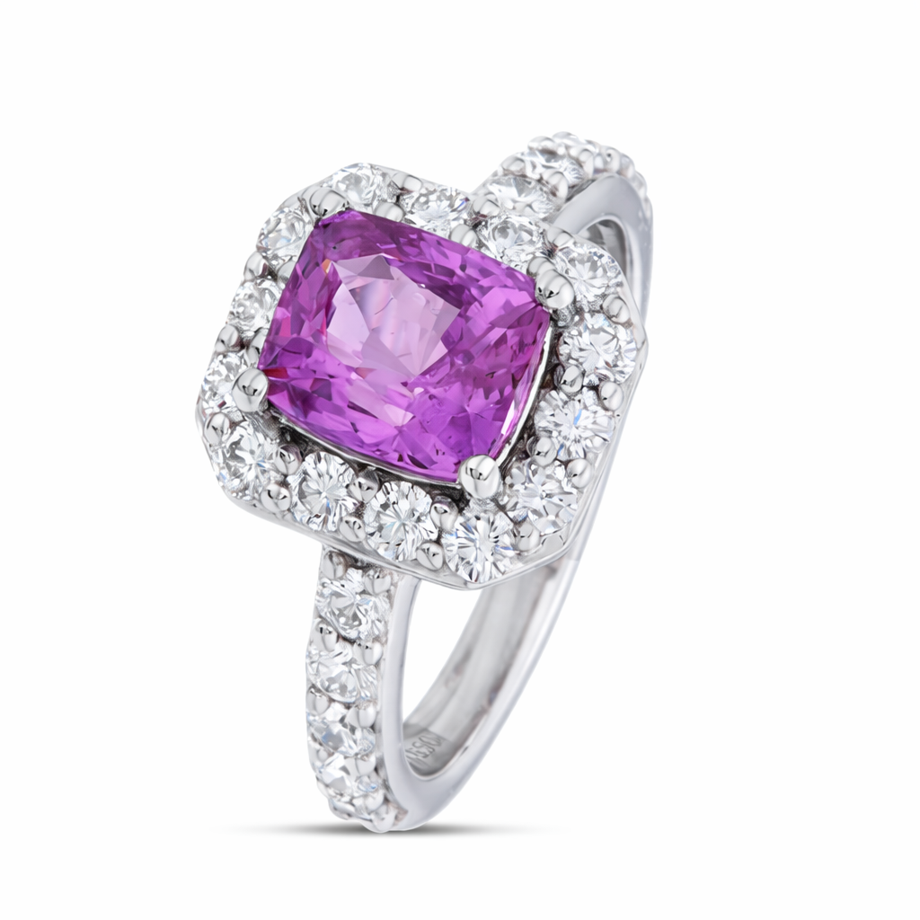 A brand-new, unused certified natural diamond and pink sapphire cluster ring that pairs vibrant colour with refined craftsmanship to create a piece of truly lasting appeal. At its centre sits a 2.15ct cushion-cut pink sapphire, displaying a purplish-pink hue full of depth, warmth and lively brilliance. Its cushion shape gives the stone a soft, elegant presence, allowing broad flashes of colour to move across the surface as it catches the light. Surrounding this striking gemstone is a halo of natural brilliant-cut diamonds totalling 0.93ct in F–G colour and VS2–SI1 clarity, with additional natural diamonds set along the shoulders to enhance the overall sparkle. These diamonds not only elevate the ring’s visual impact but also reinforce the long-standing admiration collectors hold for genuine natural diamonds, whose rarity, authenticity and enduring desirability continue to set them apart from modern alternatives.