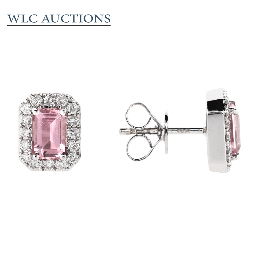 A brand-new, unused, certified pair of natural diamond & pink tourmaline gemstone emerald-shaped cluster earrings, with two octagonal-step cut pink tourmaline gemstones & a cluster of brilliant cut diamonds, set in 18ct white gold.
