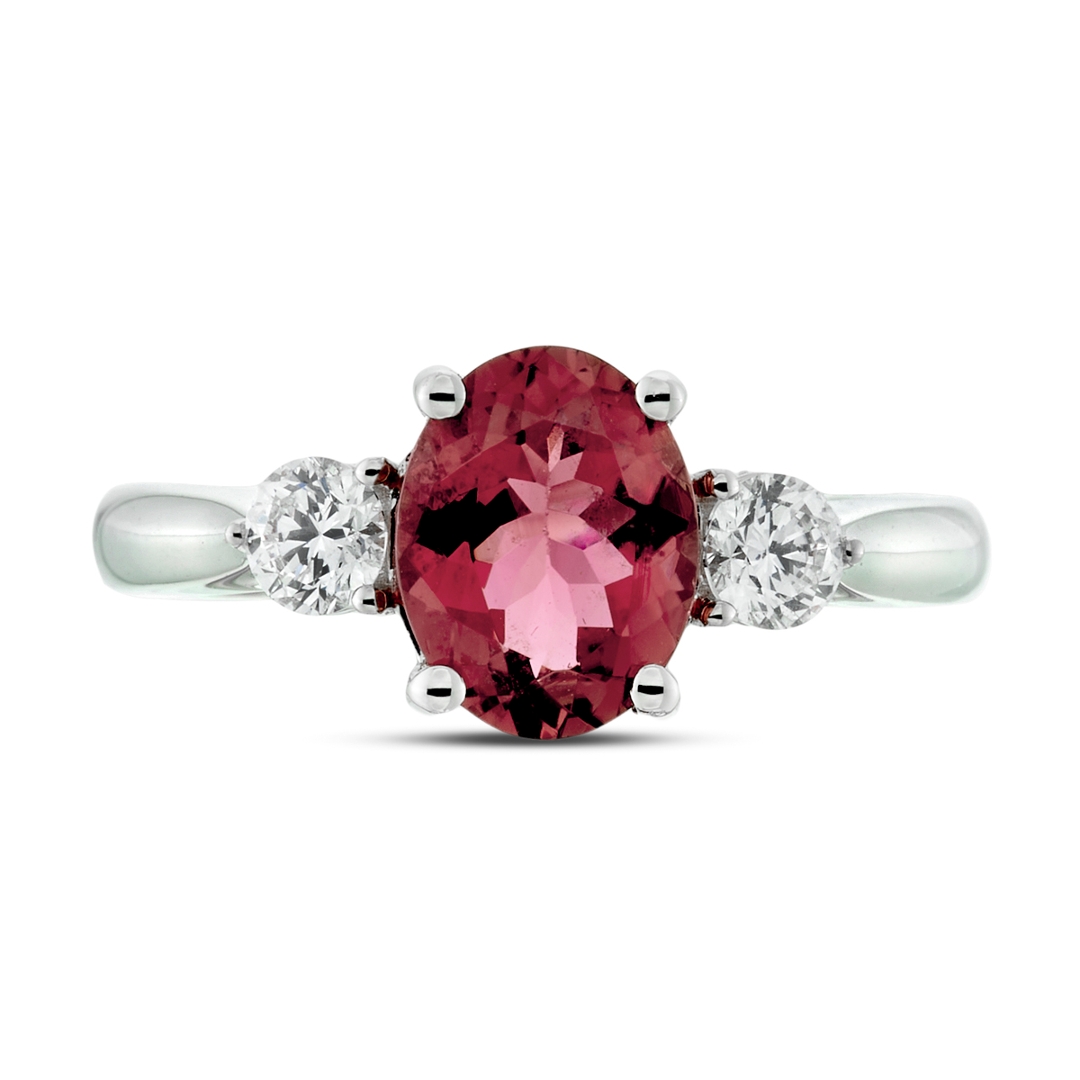 A brand-new, unused, certified natural diamond & pink tourmaline three-stone cluster ring, with one oval mixed-cut pink tourmaline gemstone to the centre & two brilliant-cut diamonds to the sides, set in platinum.