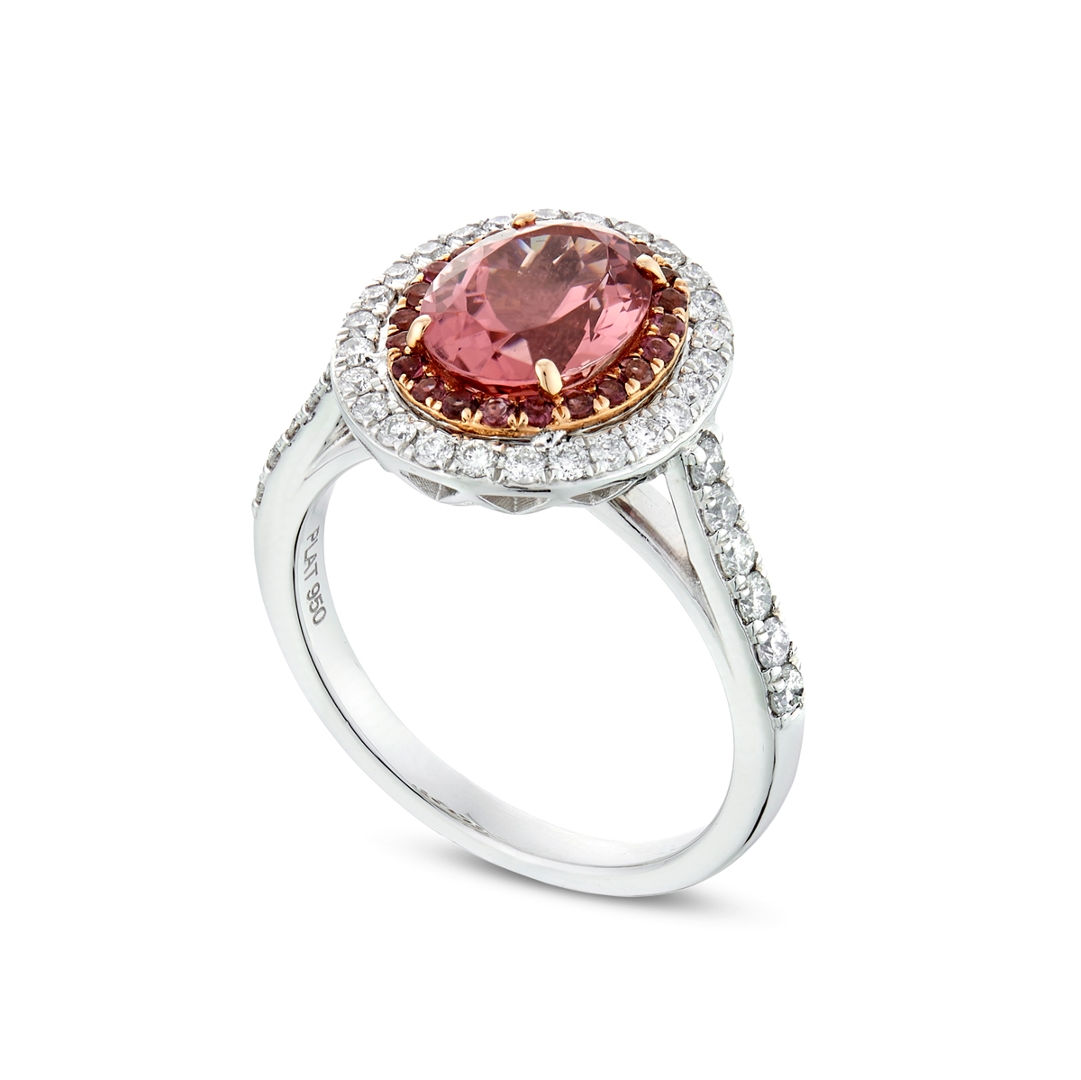 A brand-new, unused, certified natural diamond & pink tourmaline oval-shaped cluster ring, with one oval mixed-cut pink tourmaline gemstone at the centre & a cluster of round mixed-cut pink tourmaline gemstones & brilliant-cut diamonds in a double halo setting & to the shoulders, set in platinum & 18ct rose gold.