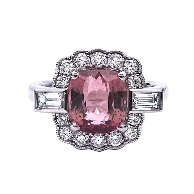 A brand-new, unused, certified natural diamond & pink tourmaline flower-shaped cluster ring, with one cushion-cut pink tourmaline gemstone at the centre, two baguette-cut diamonds to the sides & a cluster of brilliant-cut diamonds in a halo setting, set in platinum.