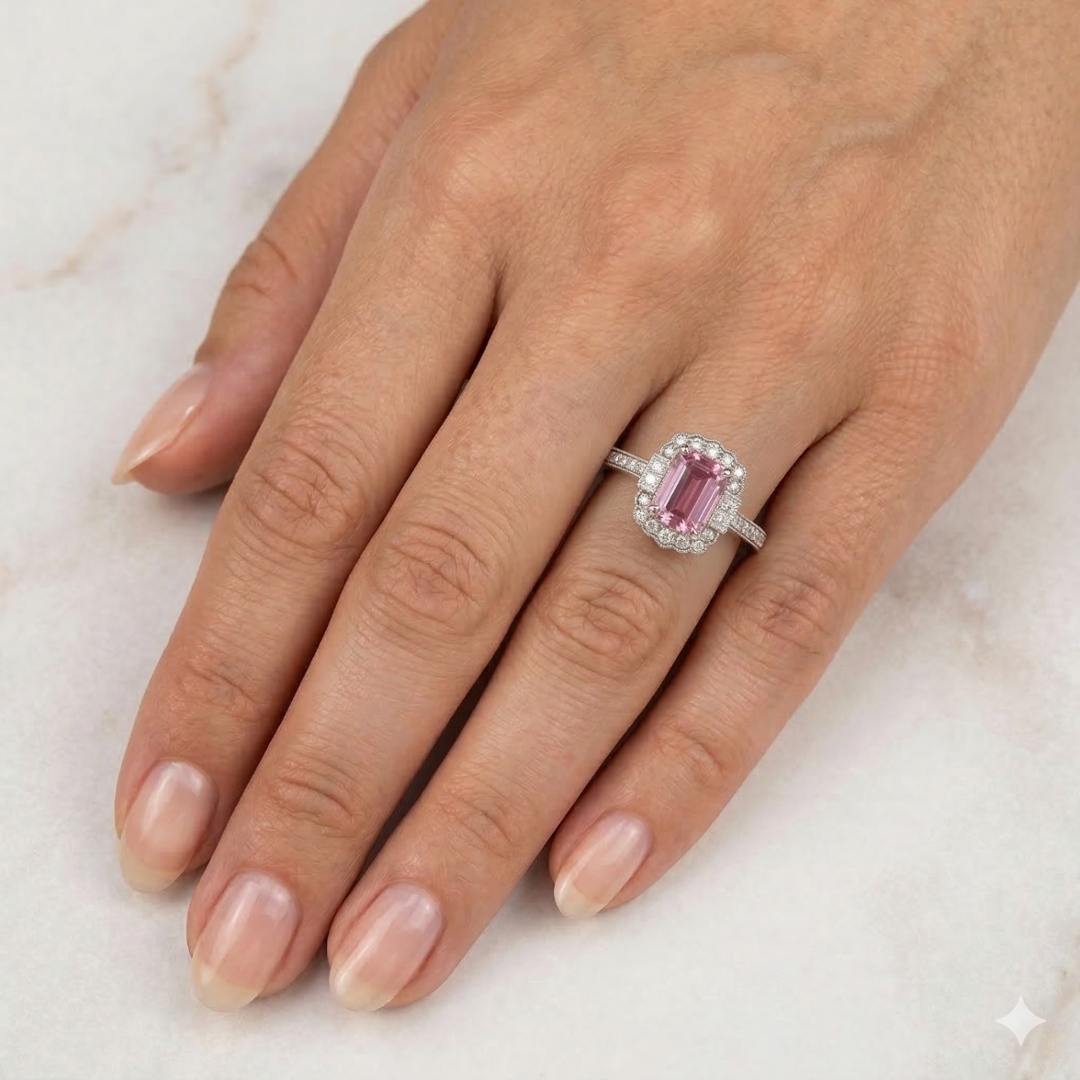 A brand-new, unused certified natural diamond and pink tourmaline flower-shaped cluster ring, finely crafted in platinum and designed to showcase an elegant balance of vivid colour and refined brilliance. At the centre of the design sits an emerald-cut pink tourmaline weighing 2.45 ct, displaying a lively, captivating pink tone that immediately attracts attention. The gemstone's clean, step-cut facets enhance its clarity and colour depth, creating a distinctive focal point that adds a sophisticated presence to the overall floral-inspired design.