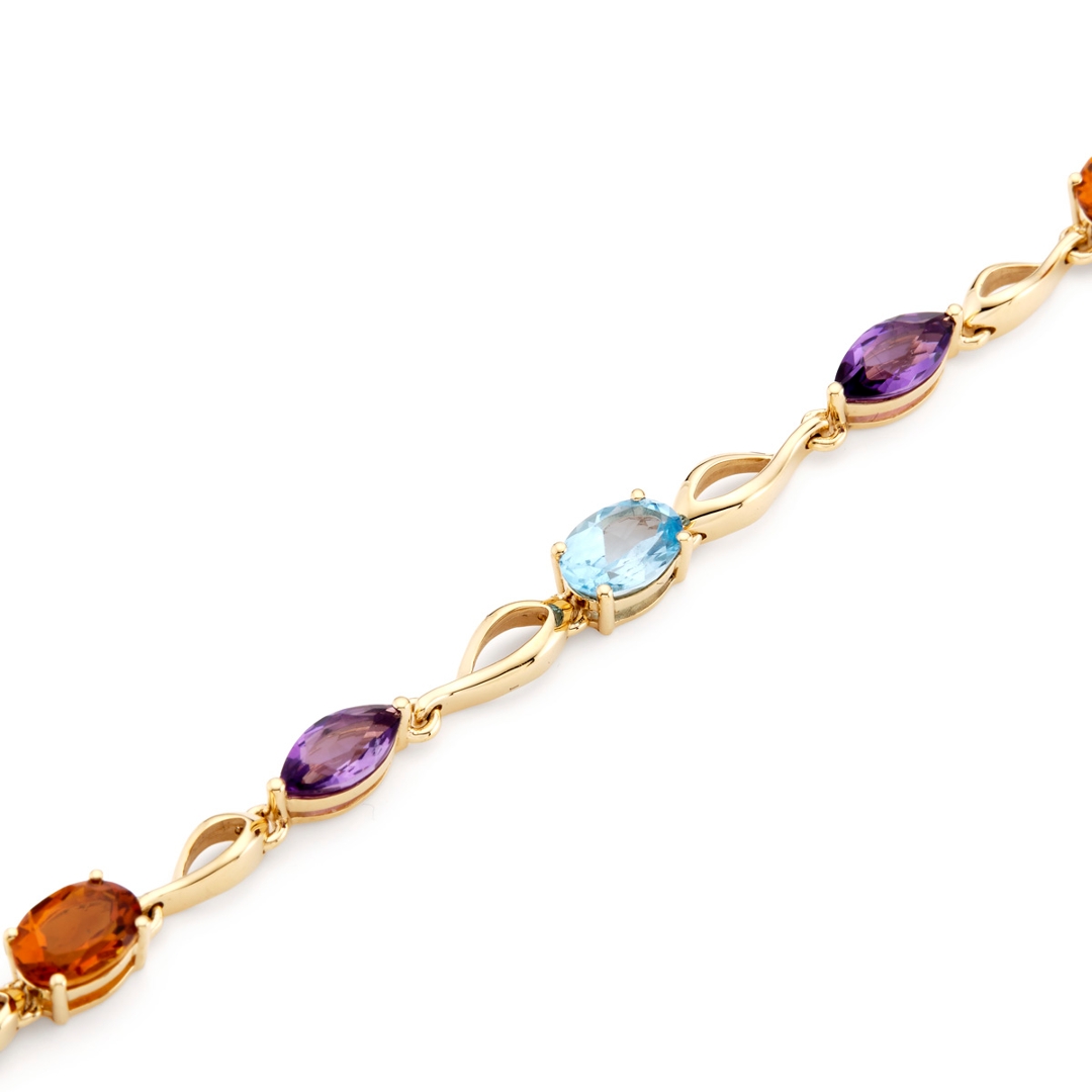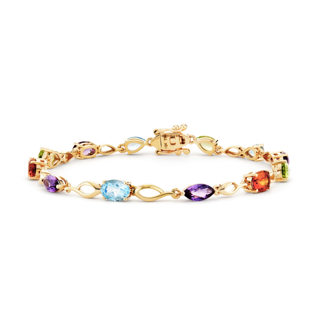 A brand-new, unused certified 18ct yellow gold bracelet showcasing a stunning array of natural multi-precious gemstones, brought together in a design that radiates colour and elegance. With a total gemstone weight of 6.66 carats, this captivating piece features a harmonious blend of mixed-shaped amethysts, citrines, peridots, and topazes. Each stone has been carefully chosen for its vivid hue, clarity and brilliance, resulting in a beautiful spectrum of rich purples, warm golden yellows, fresh greens and serene blues. The rich tones of the yellow gold setting enhance the depth and warmth of each gemstone, creating a vibrant yet sophisticated piece that stands out in any collection.
