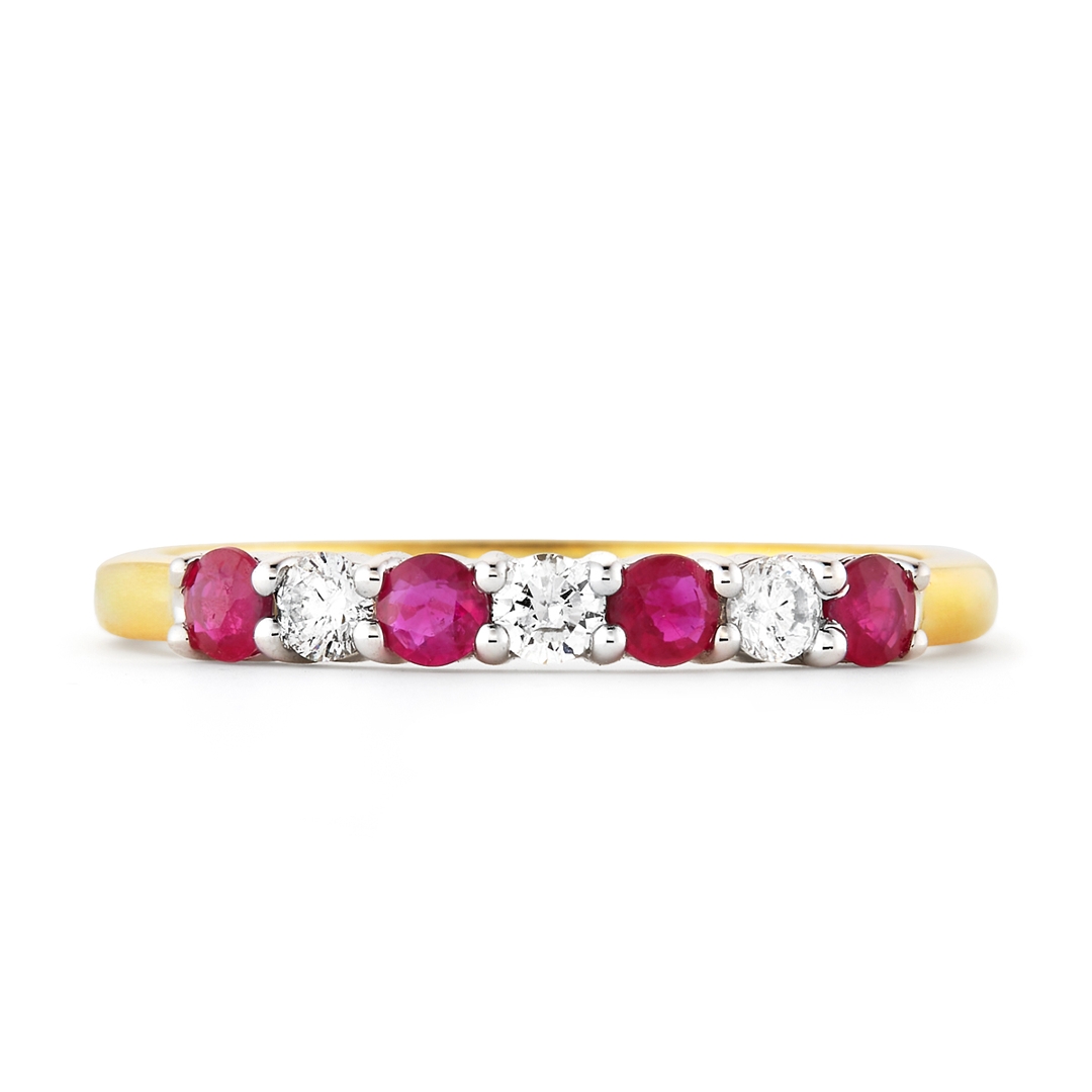 A brand-new, unused, certified natural diamond & ruby gemstone eternity ring, set with four round mixed-cut ruby gemstones & three brilliant-cut diamonds, set in 18ct yellow & white gold.
