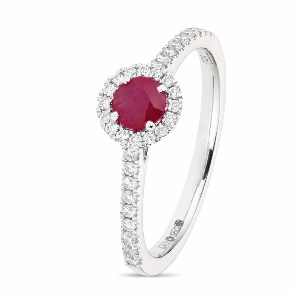 The central ruby weighs 0.45 carats and is a vibrant red, symbolising passion and love. This stunning gemstone is beautifully complemented by the surrounding diamonds, which enhance its brilliance and make the ring a striking yet elegant statement piece.