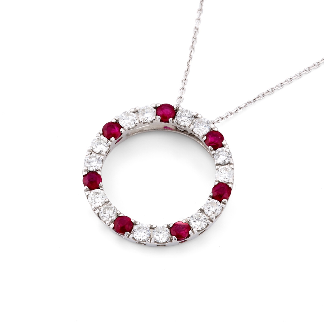 A brand-new, unused, certified natural diamond & ruby gemstone circle-shaped cluster pendant, with seven round mixed-cut ruby gemstones & a cluster of brilliant-cut diamonds, set in 18ct white gold.