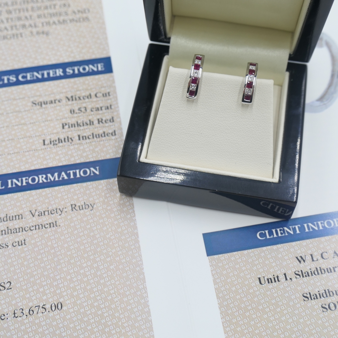 A brand new, unused certified 18ct white gold pair of natural diamond & ruby gemstone hooped earrings, set with eight square mixed cut ruby gemstones & six brilliant cut diamonds.