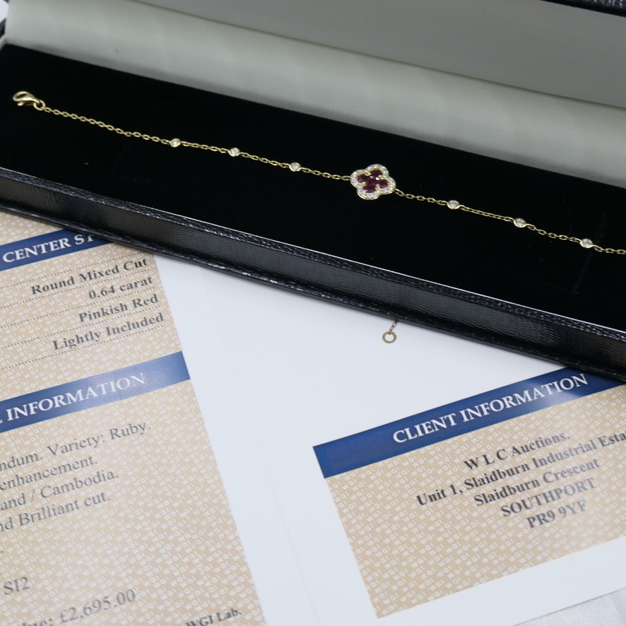 A brand-new, unused, certified natural diamond & ruby clover-shaped chain bracelet, set with five round mixed cut ruby gemstones to the centre & a cluster of brilliant-cut diamonds in a four-leaf clover design, set in 18ct yellow gold.