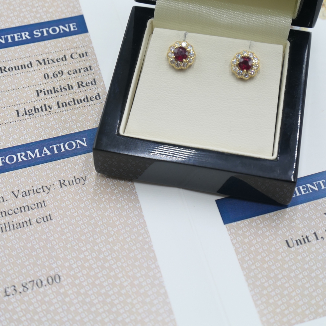 Encircling each ruby is a glittering halo of brilliant-cut natural diamonds, arranged in a delicate flower-shaped cluster. The diamonds, totalling 0.36ct, are graded between VS2 and SI1 in clarity and E to F in colour, offering exceptional brilliance and an icy sparkle that beautifully contrasts with the warm glow of the 18ct yellow gold setting. The design is both timeless and feminine, ideal for adding a refined touch of luxury to any ensemble.