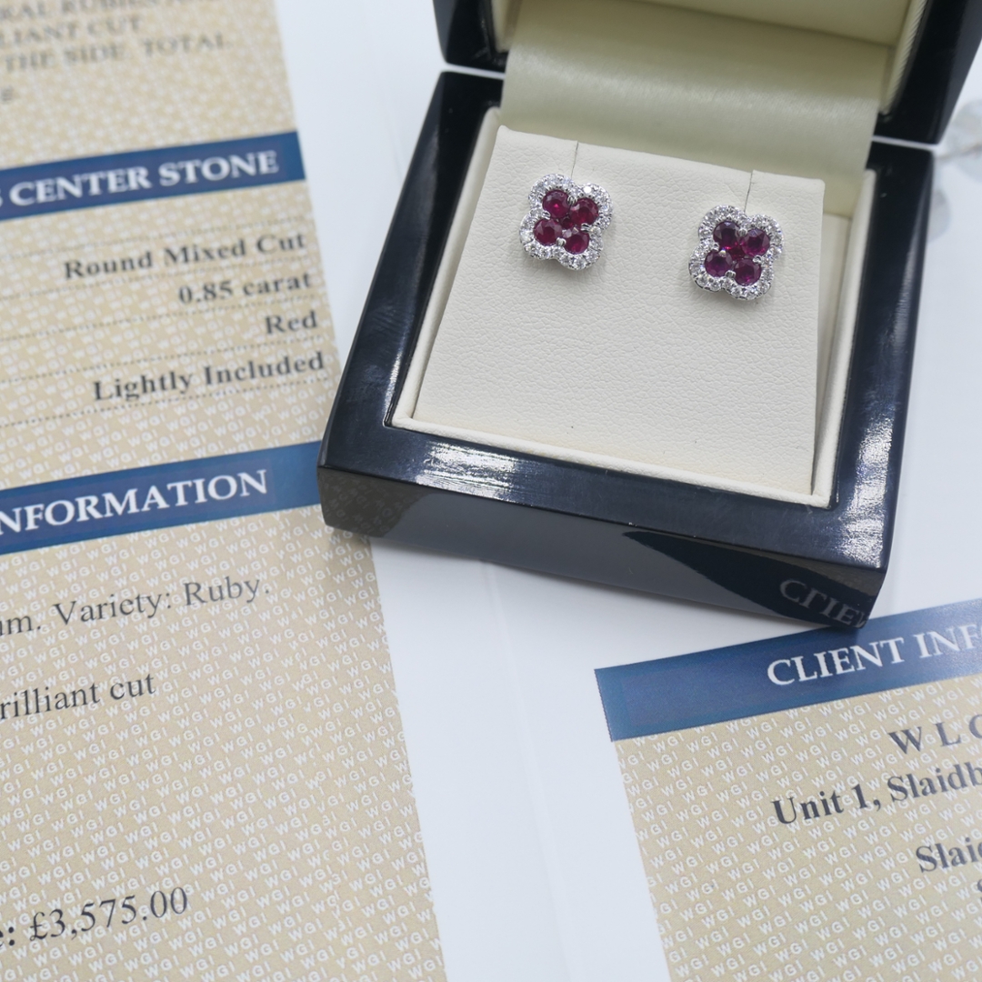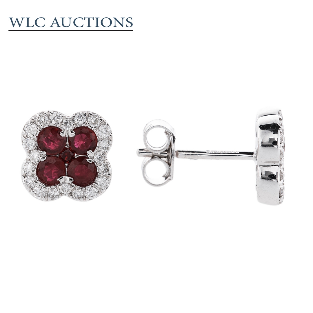 A brand-new, unused certified pair of 18ct white gold diamond and ruby clover-shaped cluster earrings crafted with precision and elegance. At the centre of each earring sits a stunning arrangement of ten round mixed-cut rubies, weighing 0.85 ct. Their deep red hue symbolises passion and vitality, beautifully complemented by the incredible sheen of white gold. Surrounding the vibrant rubies is a halo of brilliant-cut diamonds, expertly set to catch the light from every angle, creating a breathtaking sparkle with every movement.