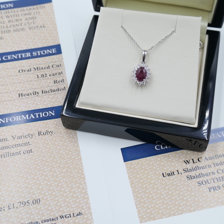 A brand-new, unused, certified natural diamond and ruby gemstone cluster pendant, this exquisite piece radiates timeless sophistication and rich, vibrant colour. Expertly crafted in 18ct white gold, it features a captivating oval mixed-cut ruby at the centre, weighing 1.02 carats. The ruby’s deep red hue symbolises passion and elegance, enhanced by its precise cut that allows light to dance across the stone with fiery brilliance. Surrounding the centrepiece is a sparkling cluster of brilliant-cut natural diamonds, together weighing 0.28 carats. Graded G–H in colour and SI1–SI2 in clarity, these diamonds create a radiant halo, intensifying the ruby’s luxurious tone with their dazzling brilliance.