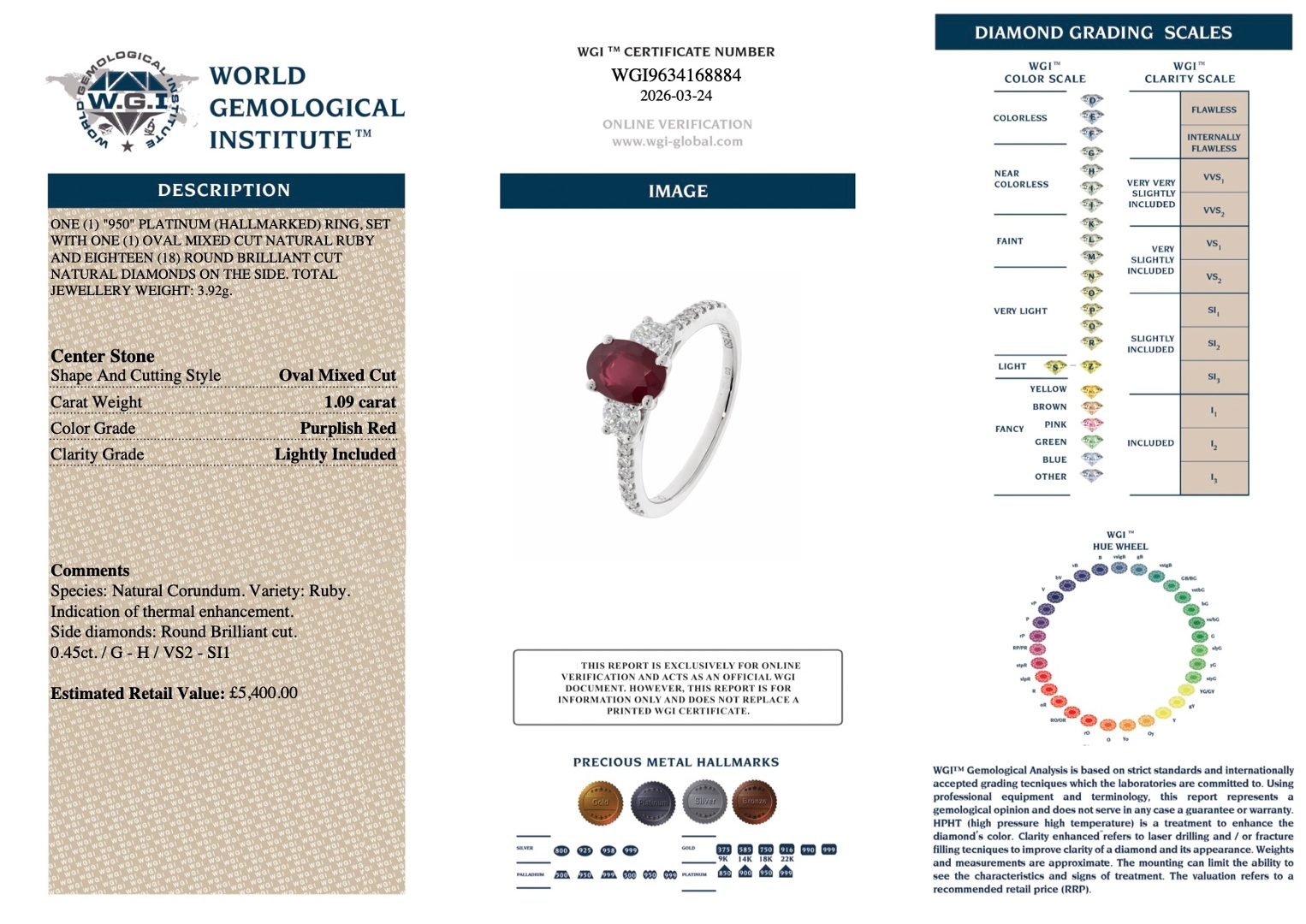 A brand-new, unused certified natural diamond and ruby three-stone cluster ring, crafted in platinum and designed to showcase a bold yet refined composition of colour and brilliance. At the centre sits an oval mixed-cut ruby weighing approximately 1.09 ct, displaying a rich purplish-red tone with excellent depth and presence. Flanked by two brilliant-cut natural diamonds and complemented by additional diamonds set along the shoulders, the design creates a layered and balanced profile that enhances both the central gemstone and the overall sparkle.