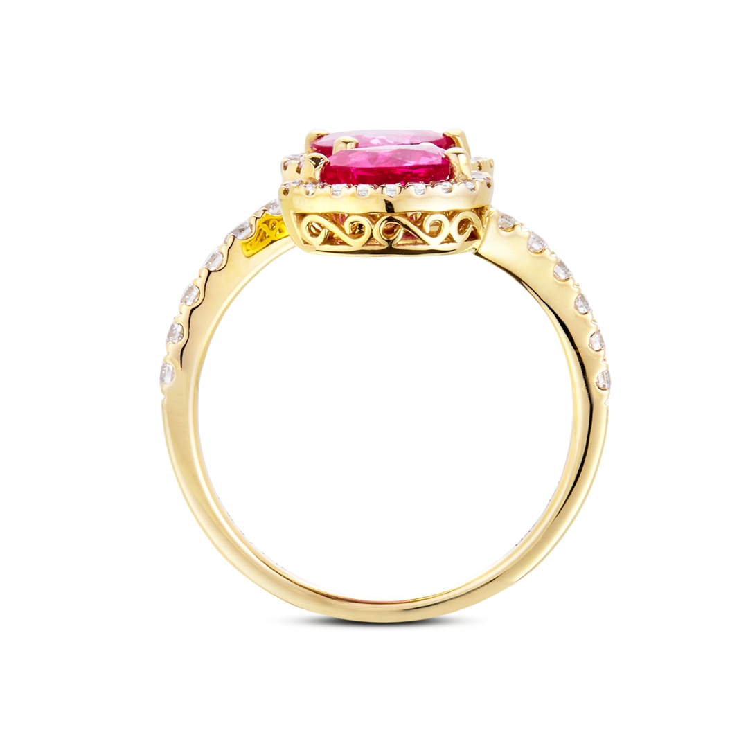A brand-new, unused certified natural diamond and ruby toi et moi ring that showcases vibrant colour, refined sparkle and an elegant, flowing silhouette. At its centre sit two pear-cut rubies, weighing 1.31ct combined, each displaying a bright pinkish-red tone that catches the light with lively warmth. Their mirrored pear shapes create a graceful curve across the finger, giving the ring a fluid, romantic appearance while allowing each ruby to stand out with its own distinct flashes of colour. Surrounding the gemstones is a halo of natural brilliant-cut diamonds, with further diamonds flowing along the shoulders, totalling 0.38ct in F–G colour and VS2–SI1 clarity. This arrangement forms a crisp, radiant frame that enhances the rubies' intensity while adding a refined brilliance that continues seamlessly down the band.