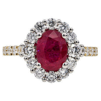 A brand-new, unused, certified natural diamond and ruby flower-shaped cluster ring, crafted in a refined combination of platinum and 18ct yellow gold to deliver both visual warmth and lasting value. At the centre sits an oval-cut ruby weighing 1.72 carats, selected for its rich red tone and natural depth of colour. Surrounding the ruby is a halo of brilliant-cut natural diamonds that continues elegantly along the shoulders, creating a cohesive floral profile. The diamonds total 0.93 carats and are carefully arranged to enhance sparkle while maintaining balance and symmetry. The contrast between platinum and yellow gold adds definition and enhances the ring's overall presence.