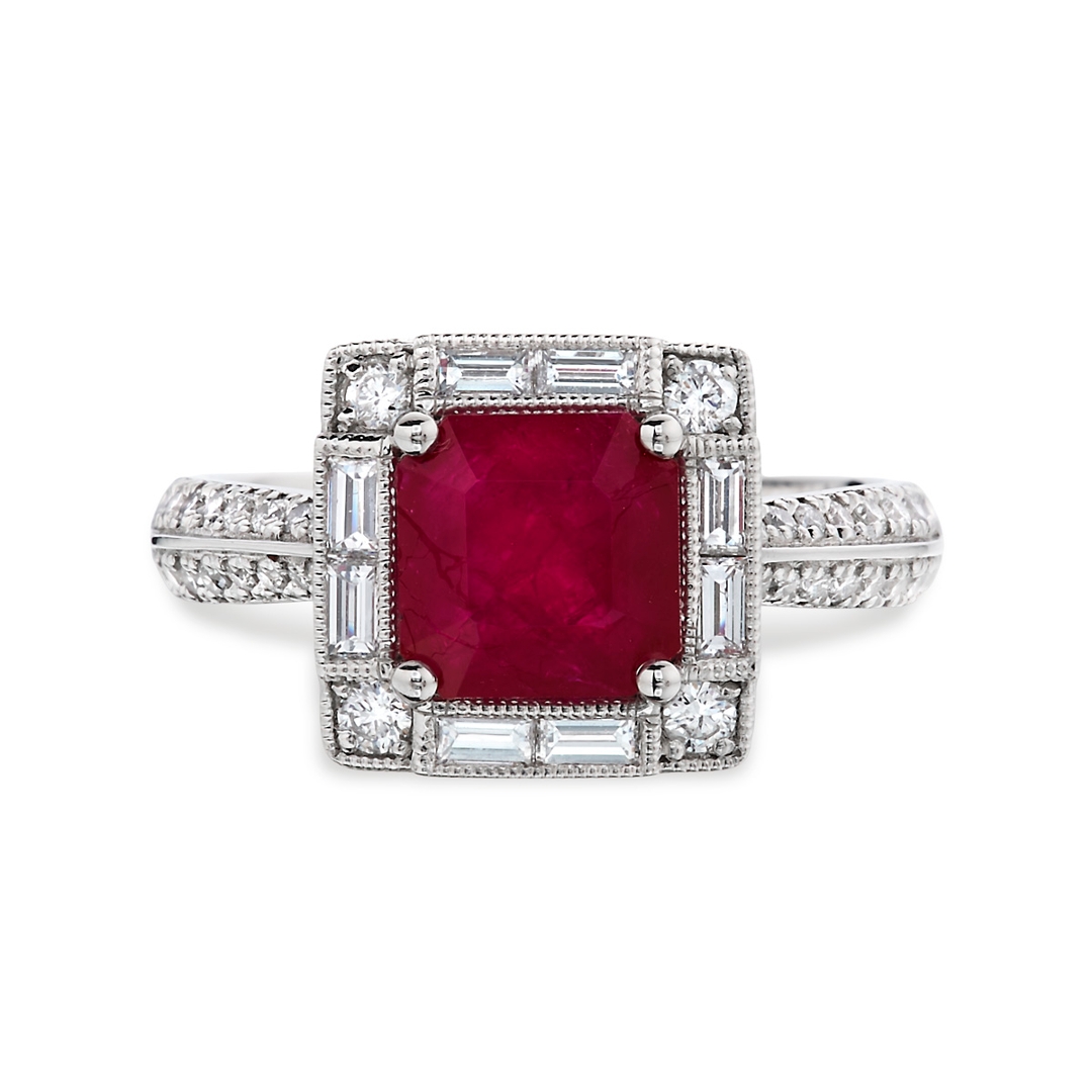 A brand-new, unused, certified natural diamond & ruby gemstone princess-shaped cluster ring, with one octagonal step-cut ruby gemstone to the centre & a cluster of baguette cut & brilliant cut diamonds in a halo setting & a cluster of brilliant cut diamonds to the shoulders, set in platinum.
