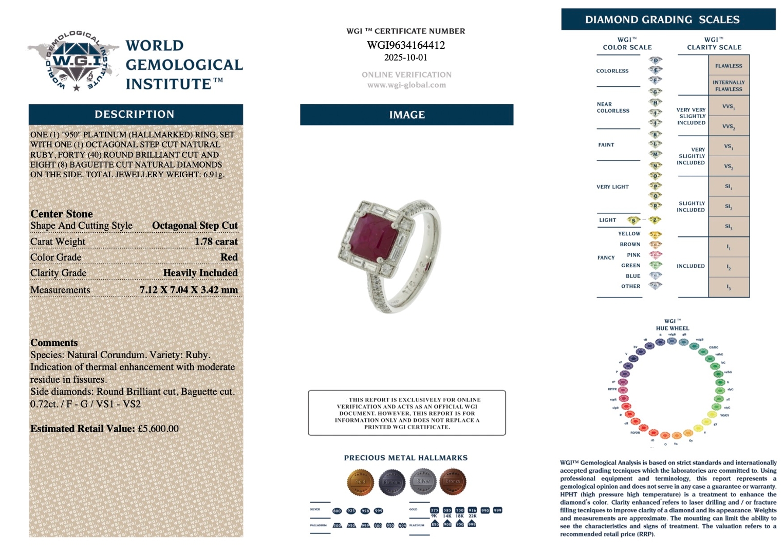 A brand-new, unused certified natural diamond and ruby cluster ring that exudes sophistication, brilliance, and timeless appeal. At its centre lies a 1.78-carat octagonal step-cut ruby, displaying an intense, captivating red hue that symbolises passion and prestige. Surrounding the central gemstone is an elegant halo of baguette-cut and brilliant-cut natural diamonds, with additional clusters of brilliant-cut diamonds set along the shoulders to enhance its radiant sparkle. The diamonds, totalling 0.72 carats, are graded F–G in colour and VS1–VS2 in clarity, offering superior brilliance, purity, and light performance that beautifully complement the ruby’s rich tone.