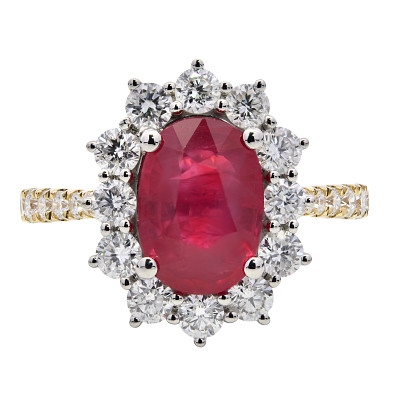 A brand-new, unused certified natural diamond and ruby cluster ring that immediately draws the eye with its vibrant colour and refined craftsmanship. At the centre sits a 2.20ct oval-cut ruby with a rich, warm tone, surrounded by a halo of brilliant-cut natural diamonds that continue along the shoulders for an elegant, continuous sparkle. The 0.93ct diamond arrangement has been carefully selected to complement the ruby’s depth, with clarity graded SI1–SI2 and colour G–H, creating a bright, lively contrast against the platinum and 18ct yellow gold setting.