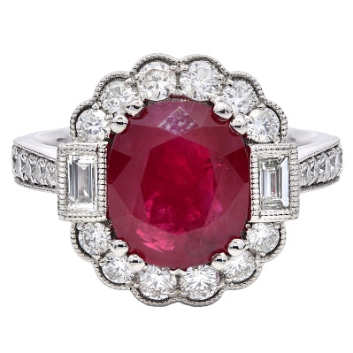 A brand-new, unused, certified natural diamond & ruby gemstone cluster ring, set with one oval-cut ruby gemstone at the centre, two baguette-cut diamonds to the sides & a cluster of brilliant-cut diamonds in a halo setting & to the shoulders, set in platinum.