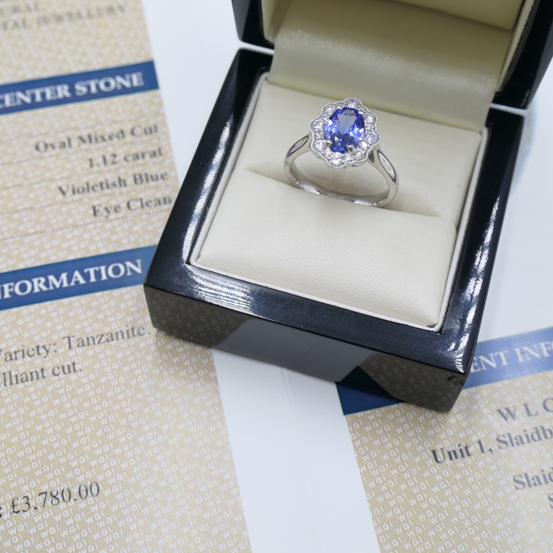 A brand-new, unused, certified platinum natural diamond and tanzanite flower-shaped cluster ring, this enchanting piece showcases an exquisite blend of colour, sparkle, and timeless design. At the heart of the ring lies a captivating 1.12ct round mixed-cut tanzanite, displaying a mesmerising violetish-blue hue that shifts beautifully in the light, symbolising uniqueness, intuition, and transformation. Encircling the centre stone is a graceful halo of brilliant-cut natural diamonds, arranged in a floral-inspired cluster that radiates elegance and brilliance.