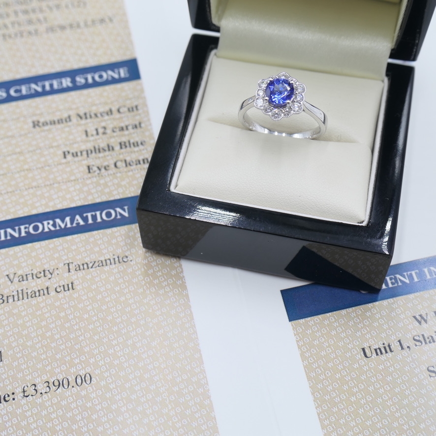 A brand-new, unused, certified platinum natural diamond and tanzanite flower-shaped cluster ring, this exquisite piece is a dazzling tribute to elegance, colour, and fine craftsmanship. At its centre, a captivating 1.12ct round mixed-cut tanzanite sparkles, glowing with a vivid purplish-blue hue that shifts enchantingly with the light. Symbolising uniqueness and emotional depth, this rare gemstone is beautifully embraced by a halo of brilliant-cut natural diamonds, arranged in a graceful, flower-inspired cluster setting.