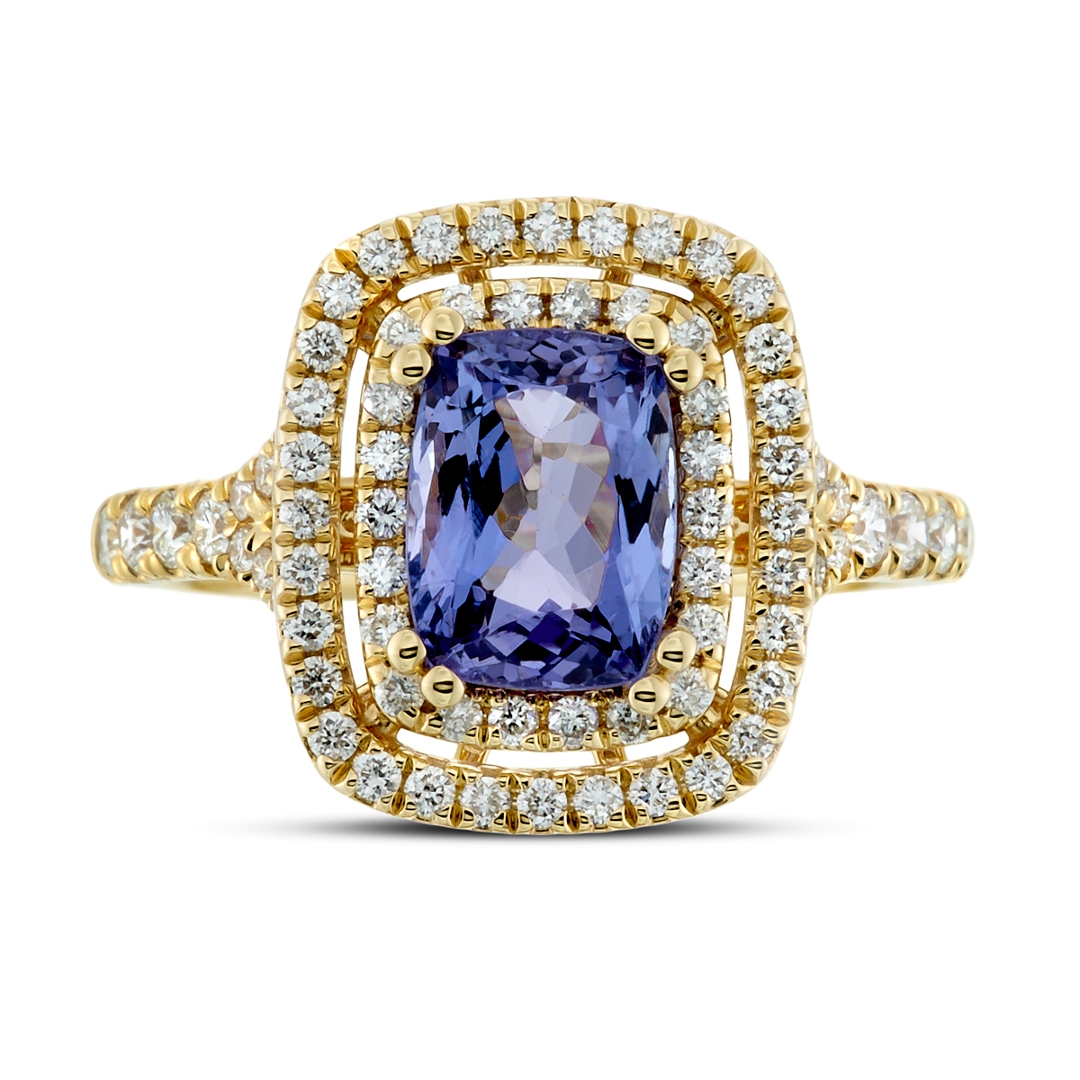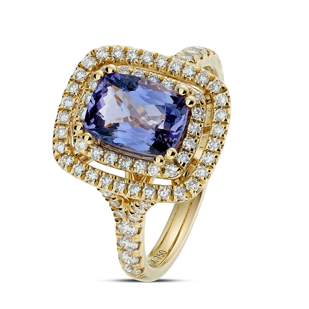 A brand-new, unused, certified natural diamond & tanzanite cushion-shaped cluster ring, with one cushion-cut tanzanite gemstone to the centre & a cluster of brilliant-cut diamonds in a double halo setting & on the shoulders, set in 18ct yellow gold.