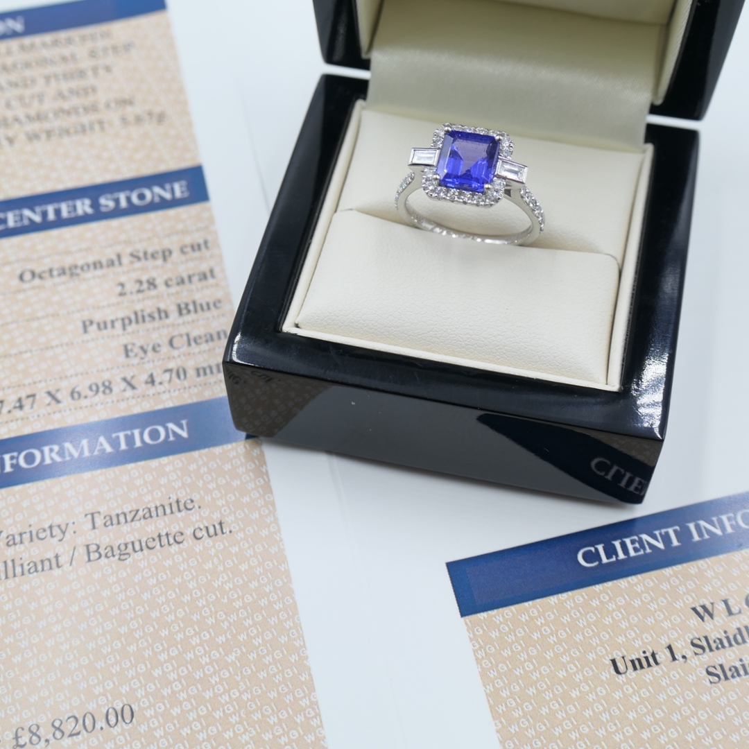 A brand-new, unused, certified natural diamond and tanzanite cluster ring that radiates opulence and refined sophistication. At its centre lies a striking 2.28-carat octagonal step-cut tanzanite, displaying a mesmerising purplish-blue hue that shifts beautifully under the light. Flanking the central gemstone are two baguette-cut diamonds, adding a touch of structure and symmetry to the design. Surrounding the tanzanite is a halo of brilliant-cut natural diamonds that extend gracefully along the shoulders, enhancing the ring’s brilliance and presence. With a total diamond weight of 0.58 carats, graded G–H in colour and SI2 in clarity, the diamonds add exceptional sparkle and balance to the tanzanite's vivid tone.