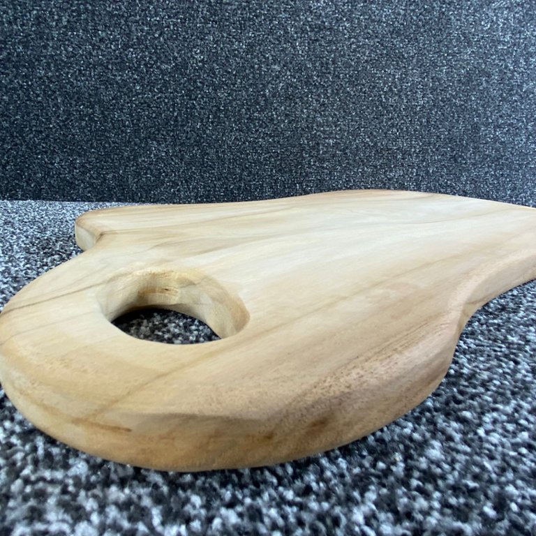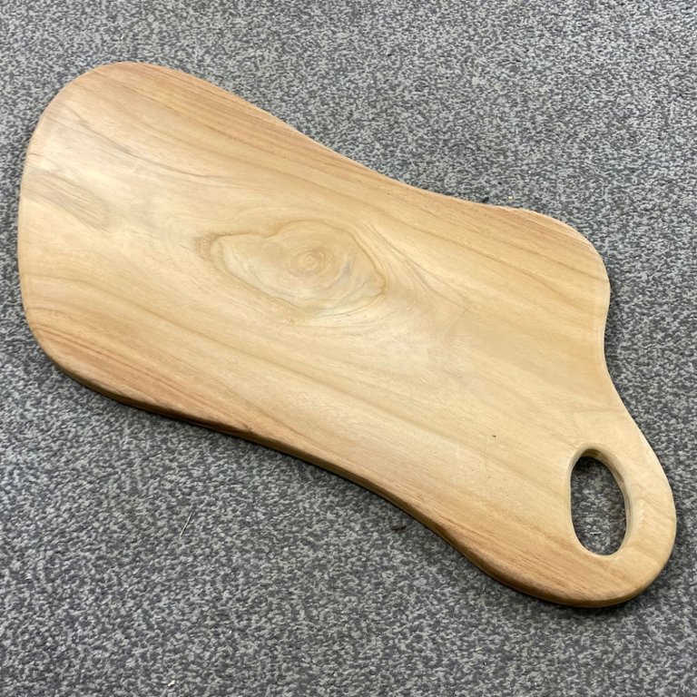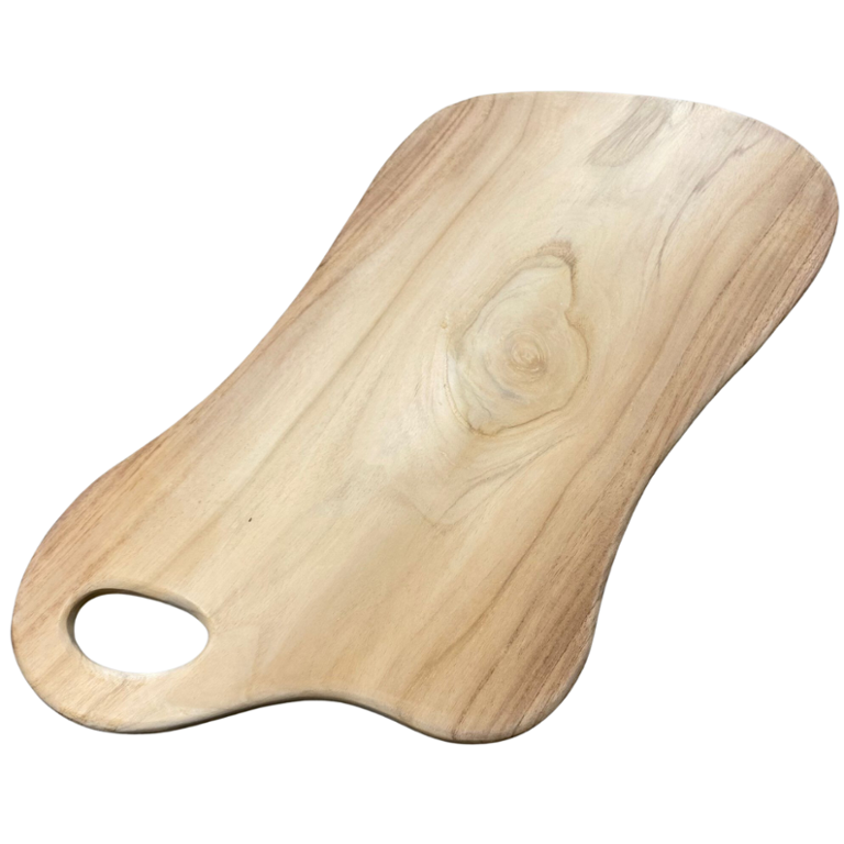 A natural Teak wooden chopping board with a handle. Approx 25" height, 12" width.