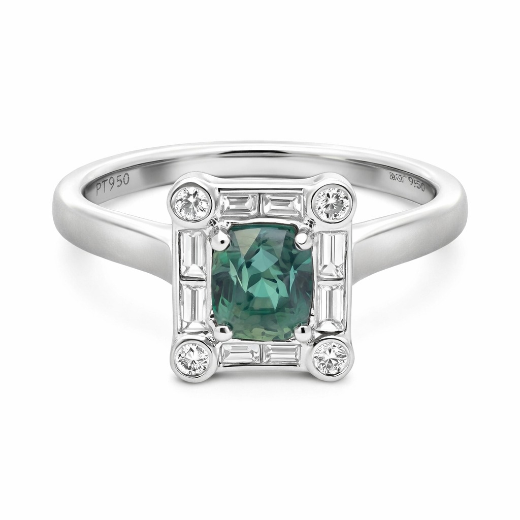 A brand-new, unused certified natural diamond and teal sapphire princess-shaped cluster ring that combines striking colour, refined geometry, and the long-standing desirability of genuine gemstones. At its centre sits a 1.16ct cushion-cut teal sapphire, displaying a vivid blend of blue and green tones that gives the piece a distinctive, contemporary character. Surrounding the sapphire is a sophisticated arrangement of natural diamonds in both baguette and brilliant cuts, forming a radiant halo that enhances the gemstone’s depth while adding crisp flashes of light. With a total diamond weight of 0.38ct in G–H colour and SI clarity, these natural diamonds provide energetic sparkle and carry the strong appreciation factor buyers consistently seek, admired for their authenticity, rarity, and enduring presence in the fine jewellery world.