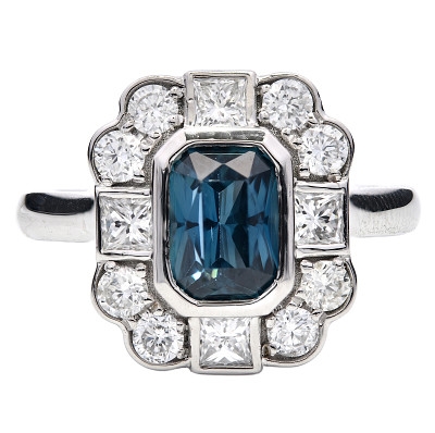 A brand-new, unused, certified natural diamond & teal sapphire flower-shaped cluster ring, with one emerald-cut teal sapphire gemstone at the centre & a cluster of princess-cut & brilliant-cut diamonds in a halo setting, set in platinum.