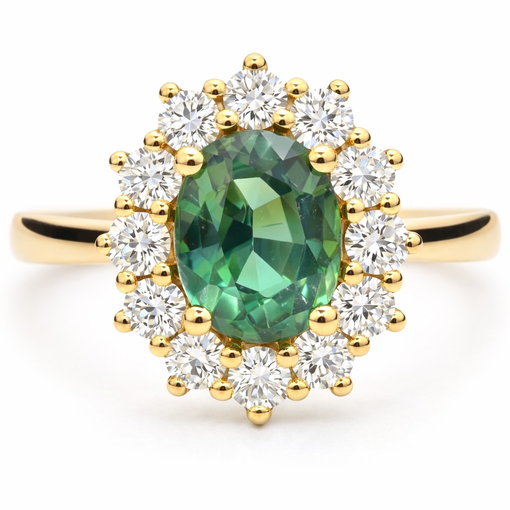 A brand-new, unused, certified natural diamond & teal sapphire cluster ring, with one oval-cut teal sapphire gemstone at the centre & twelve brilliant-cut diamonds in a halo setting, set in 18ct yellow gold.