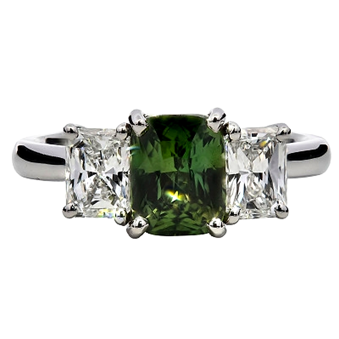 - > Natural Teal Sapphire 1.65ct & Diamond 1.03ct Three Stone Cluster Ring