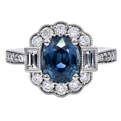 A brand-new, unused, certified natural diamond and teal sapphire flower-shaped cluster ring, crafted in platinum and presented in pristine condition. At the centre is an oval-cut teal sapphire weighing 2.04 carats, selected for its distinctive blue-green hue, natural depth, and elegant proportions. The sapphire is flanked by two baguette-cut natural diamonds, introducing clean linear contrast, while a surrounding halo of brilliant-cut natural diamonds forms a refined floral outline. The total diamond weight is 0.72 carats, arranged to enhance brightness and symmetry without detracting from the individuality of the centre stone.