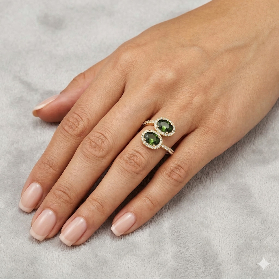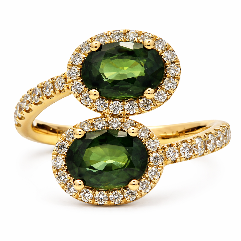 A brand-new, unused certified natural diamond and teal sapphire toi et moi cluster ring, beautifully crafted in 18ct yellow gold and designed to showcase a distinctive and romantic dual-stone composition. At the centre of the design sit two oval-cut teal sapphires, weighing a combined 2.14ct, whose captivating blue-green tones create a striking and contemporary focal point. The toi et moi style, meaning “you and me”, has long symbolised unity and connection, making this elegant pairing both meaningful and visually compelling within the warm glow of the yellow gold setting.