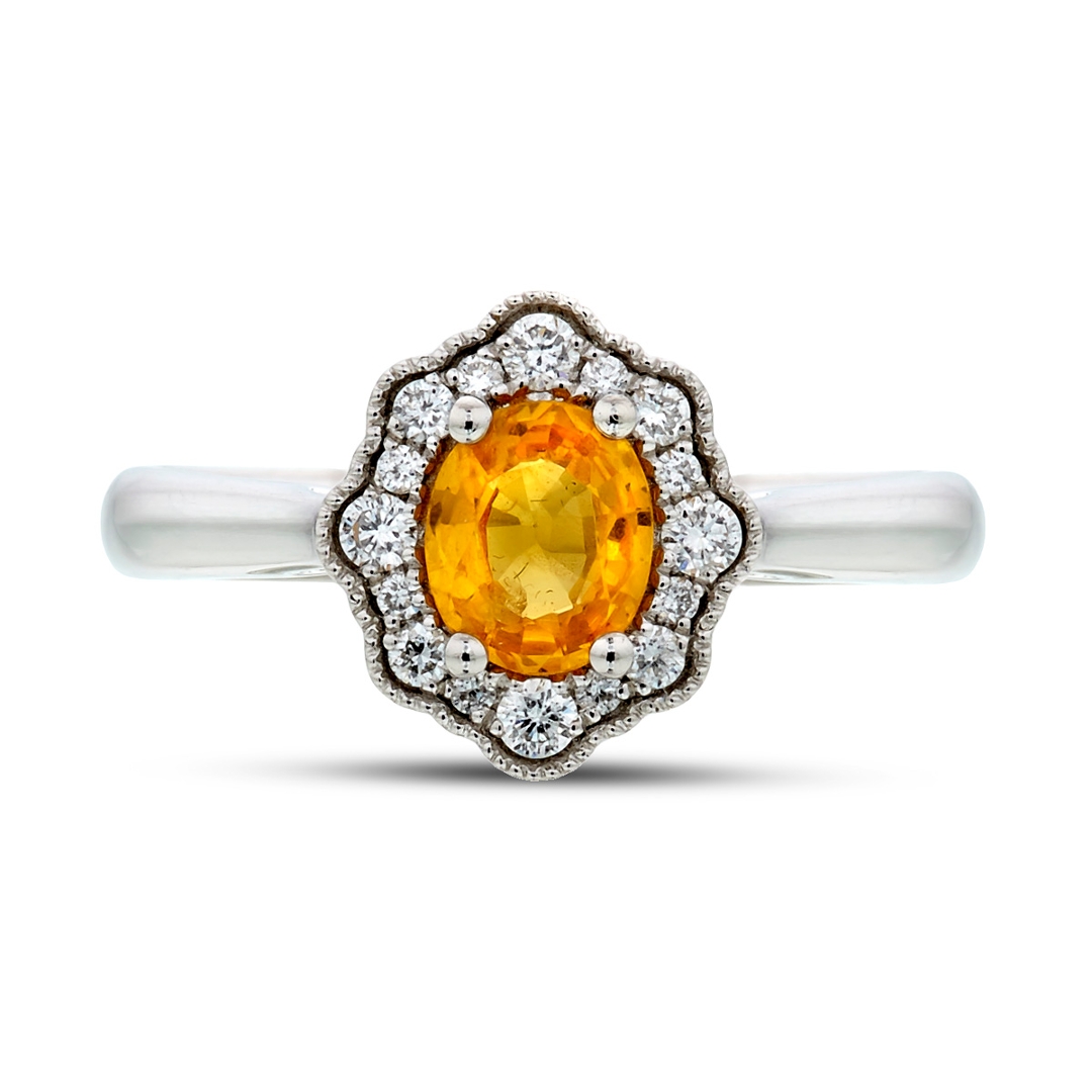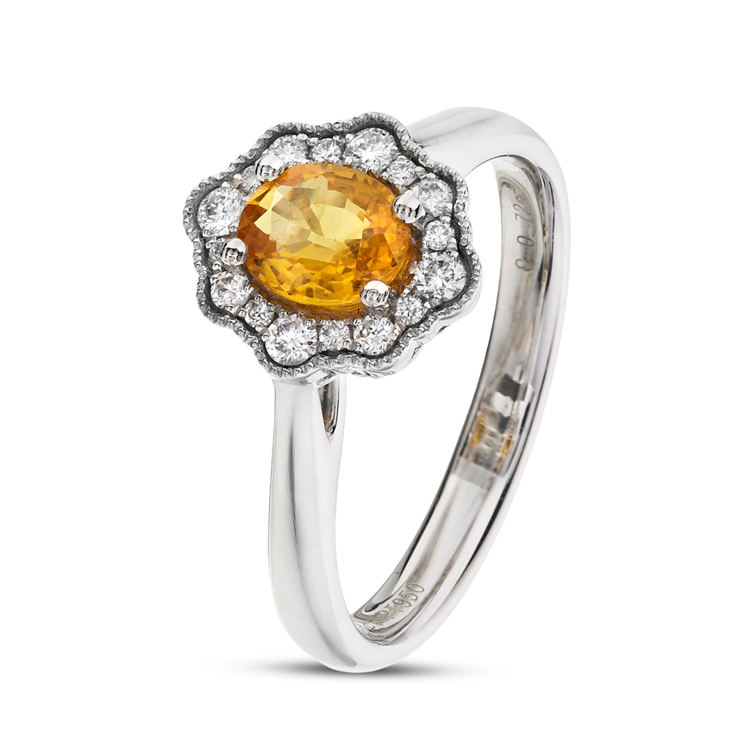 A brand-new, unused, certified natural diamond & yellow sapphire gemstone flower-shaped cluster ring, with one oval mixed-cut yellow sapphire gemstone to the centre & a cluster of brilliant cut diamonds in a halo setting, set in platinum.