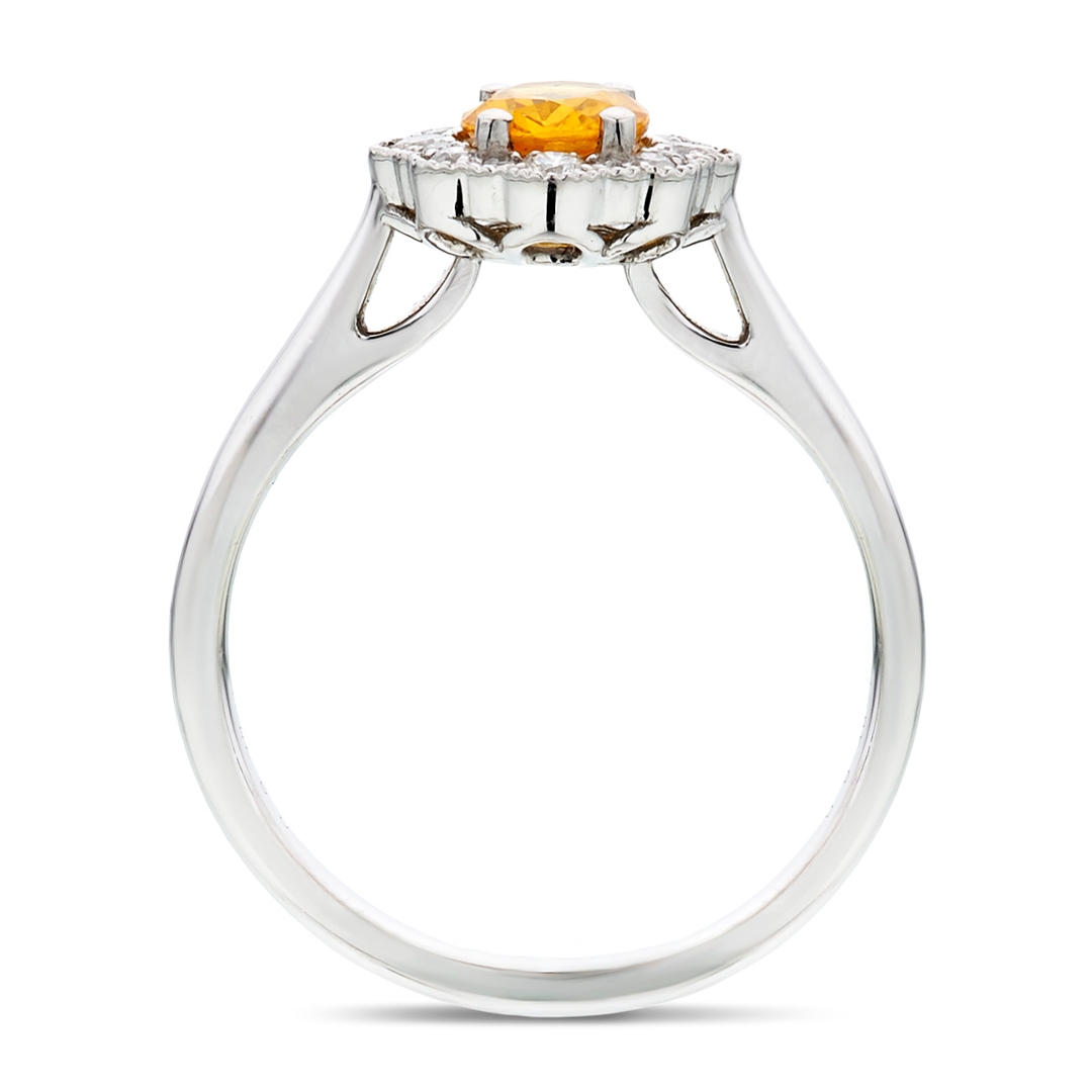 A brand-new, unused certified natural diamond and yellow sapphire cluster ring that radiates timeless elegance and vibrant sophistication. At its centre rests a 0.62-carat oval mixed-cut yellow sapphire, glowing with a rich, golden hue that evokes warmth and optimism. Surrounding the gemstone is a beautifully arranged flower-shaped halo of brilliant-cut natural diamonds, adding exceptional sparkle and contrast to the design. The diamonds, totalling 0.18 carats, are graded F–G in colour and VS2–SI1 in clarity, offering superior brilliance that enhances the sapphire’s vivid tone with refined luminosity.