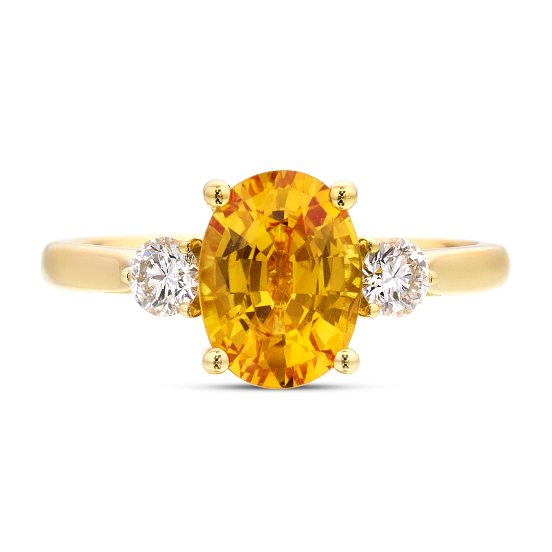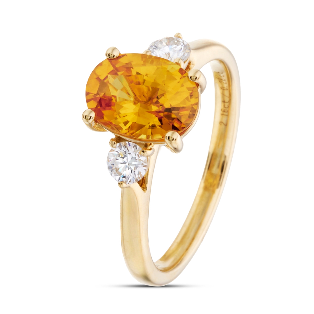 A brand-new, unused certified natural diamond and yellow sapphire three-stone ring that brings together vibrant colour, refined sparkle and an elegant sense of balance. At its centre is a 2.16ct oval mixed-cut yellow sapphire, displaying a bright, uplifting yellow tone, full of warmth and lively brilliance. The oval shape enhances the stone’s natural radiance, creating a flattering and elongated profile that catches the light beautifully with every movement.