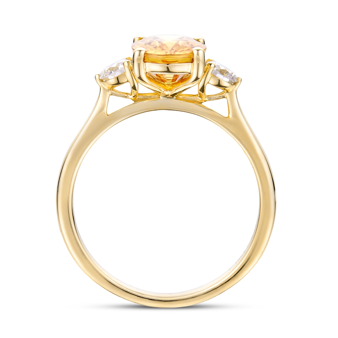 A brand-new, unused, certified natural diamond & yellow sapphire three-stone cluster ring, set with one oval mixed-cut yellow sapphire gemstone at the centre & two brilliant-cut diamonds to the sides, set in 18ct yellow gold.