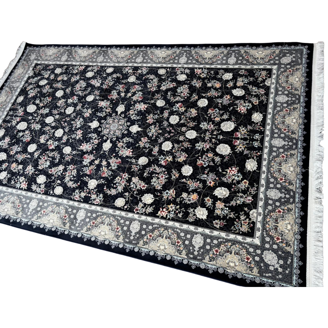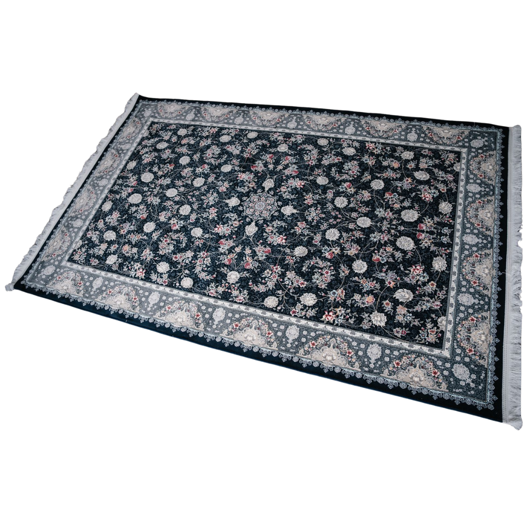 A finely woven Persian-style carpet showcases a deep navy blue base, beautifully decorated with an all-over floral design. The soft ivory and rose-toned blossoms create a striking contrast against the dark background, while the ornate grey and cream border frames the piece with elegance and balance.